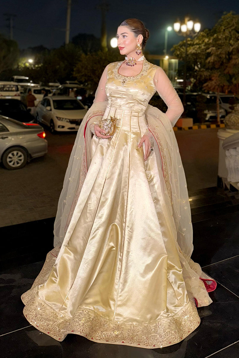 A timeless charmeuse silk pishwas with a magnificent royal flare, featuring delicate handwork on the neckline and an embroidered border at the hem. Paired with a heavily adorned net dupatta and intricate gotta detailing across the panels, this ensemble exudes regal elegance.