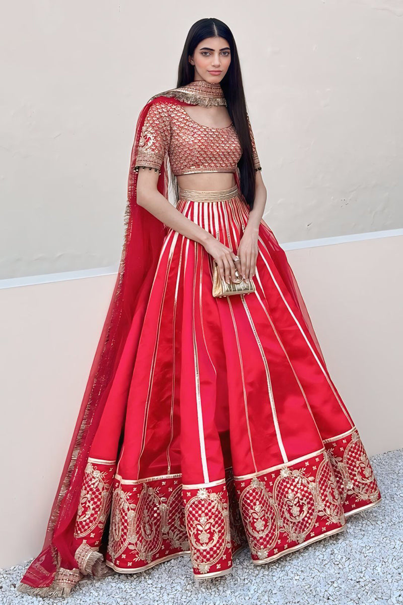 A striking lehnga with magnificent flare, adorned with extravagant gotta work. The belt showcases intricate dabka and nakshi craftsmanship, while the sleeves feature delicate hand embroidery, making this ensemble a timeless statement of grandeur.