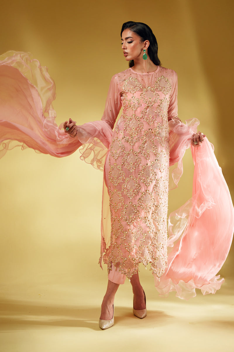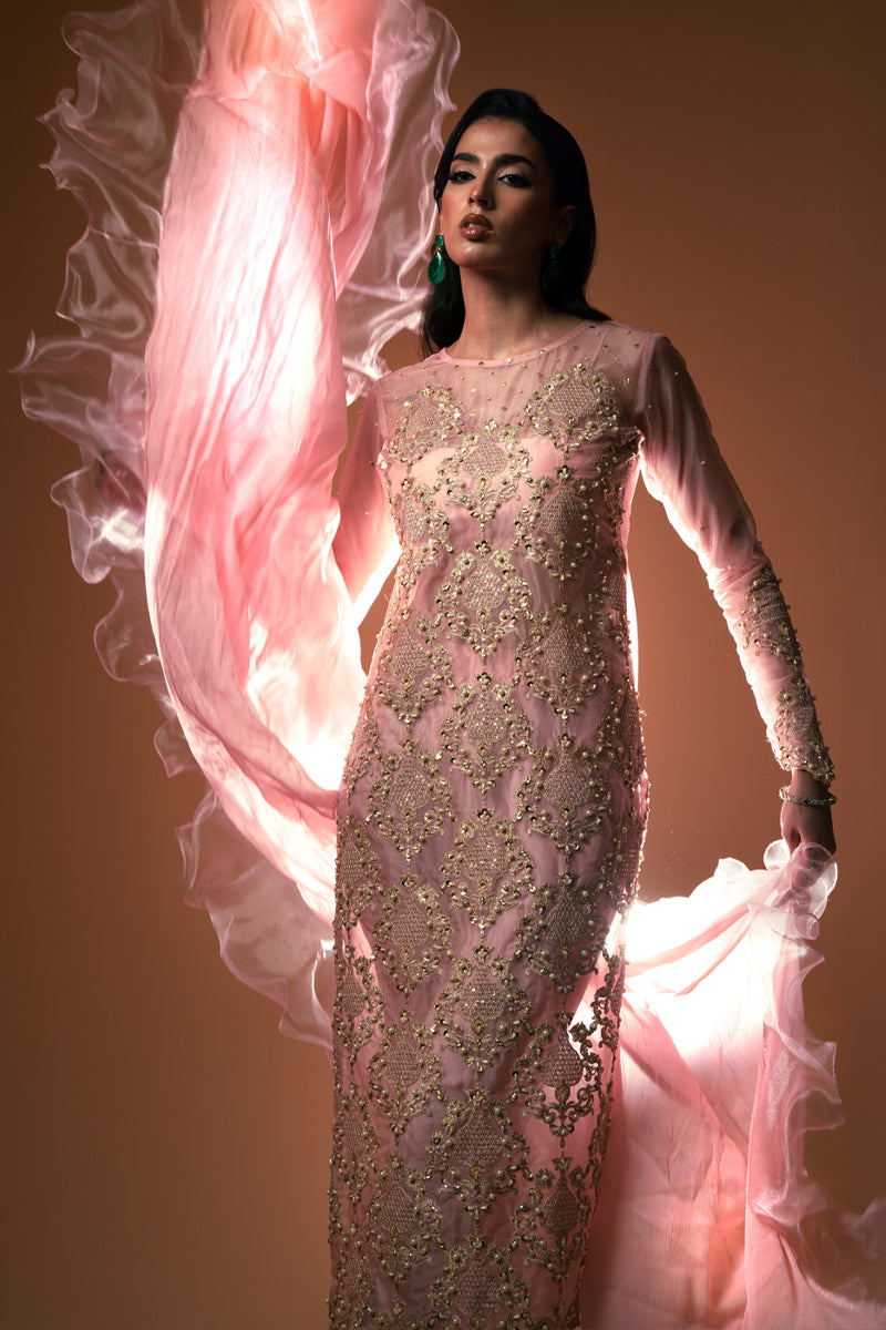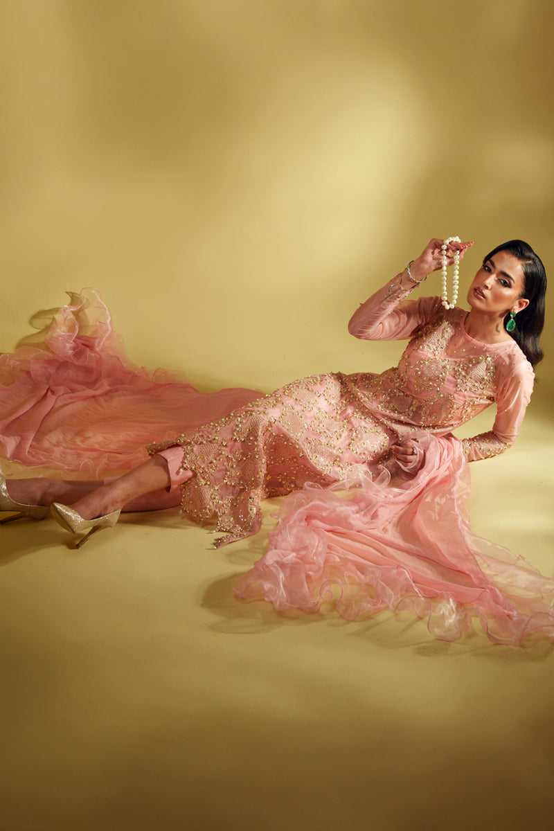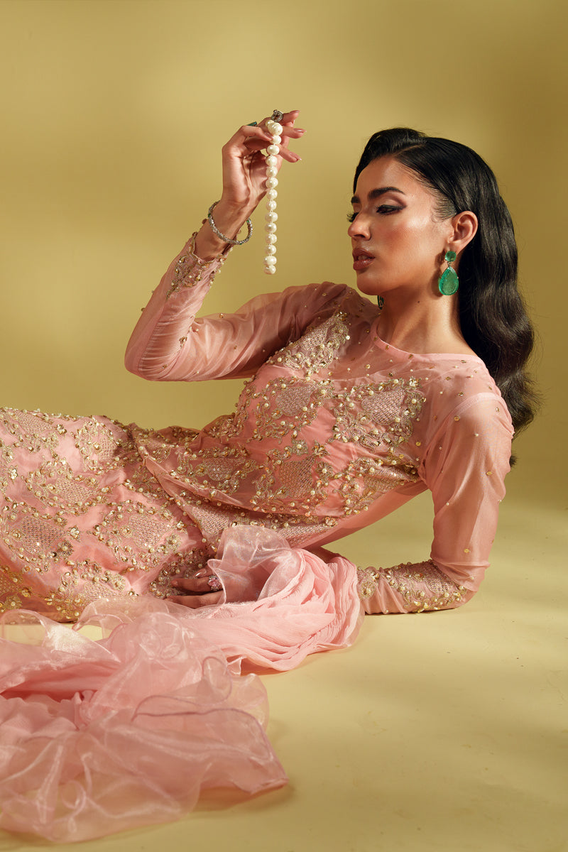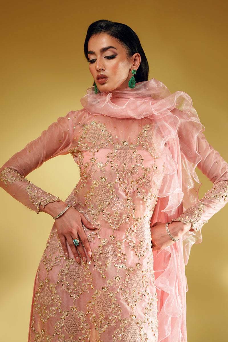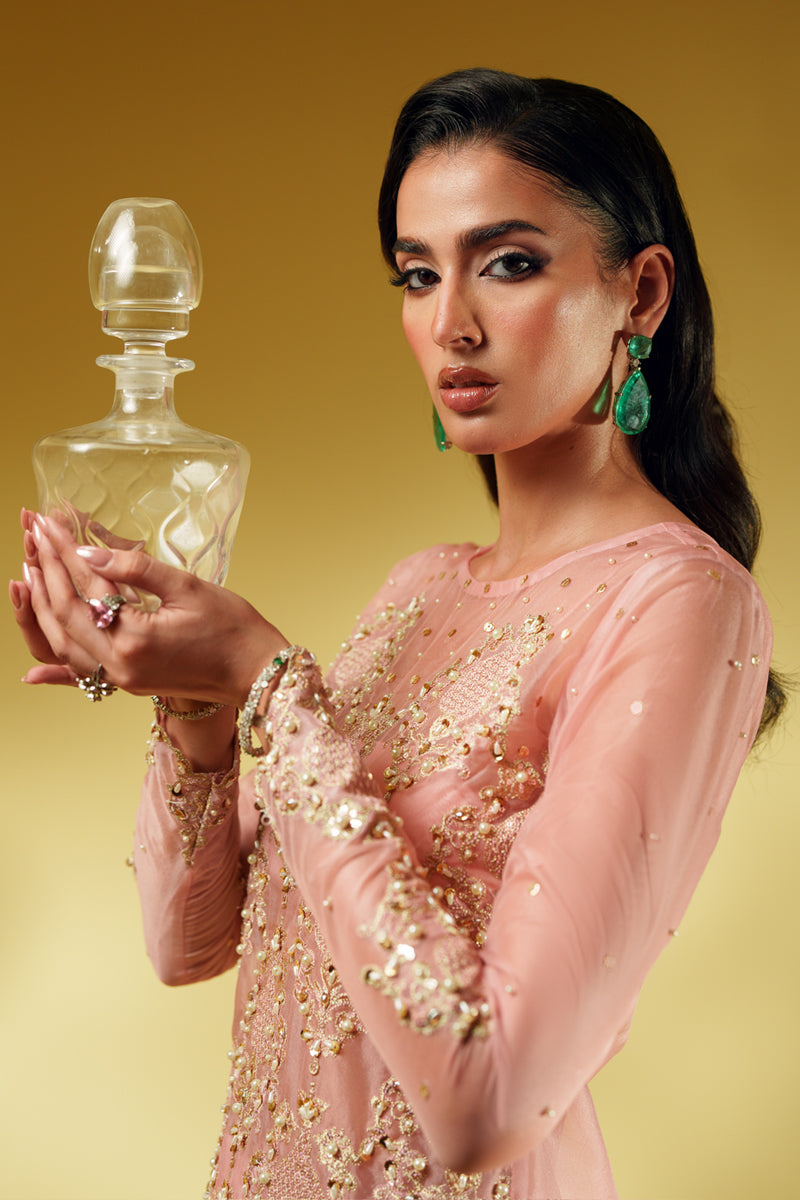 An ode to modern regality, Aveline is crafted in pure organza and drenched in golden tilla embroidery, brought to life with lavish handwork of sequins and pearls. The silhouette glows in a soft blush tone, exuding quiet strength and undeniable luxury. Every detail is thoughtfully crafted to reflect a royal essence, while the ensemble can be delivered with full lining for ease and elegance. The dupatta—fluid, ethereal, and unapologetically dramatic—adds the final stroke of artistry to this masterpiece.