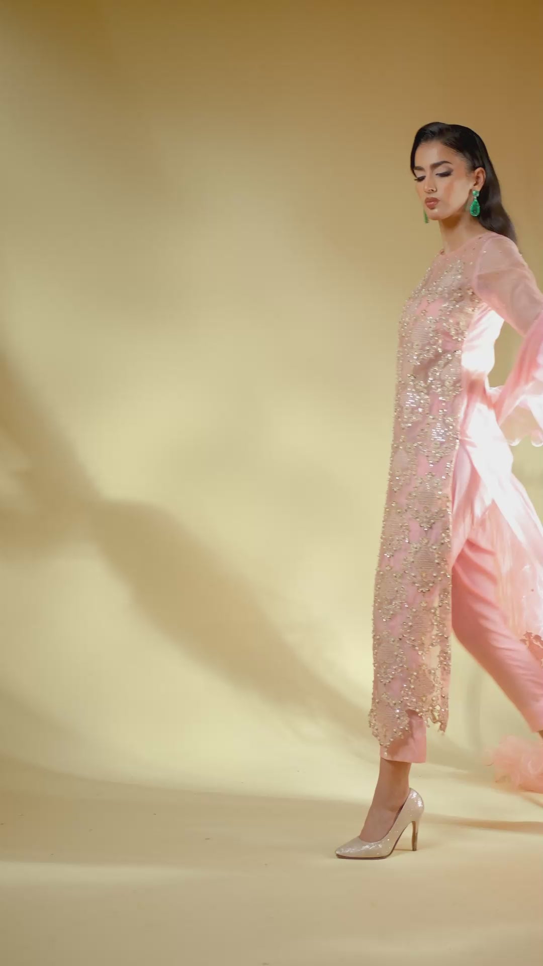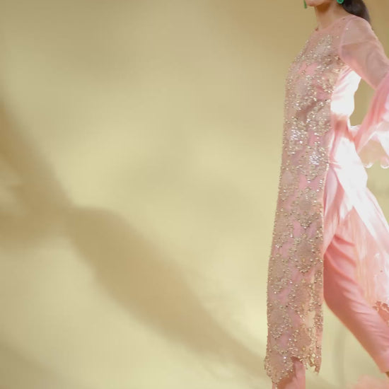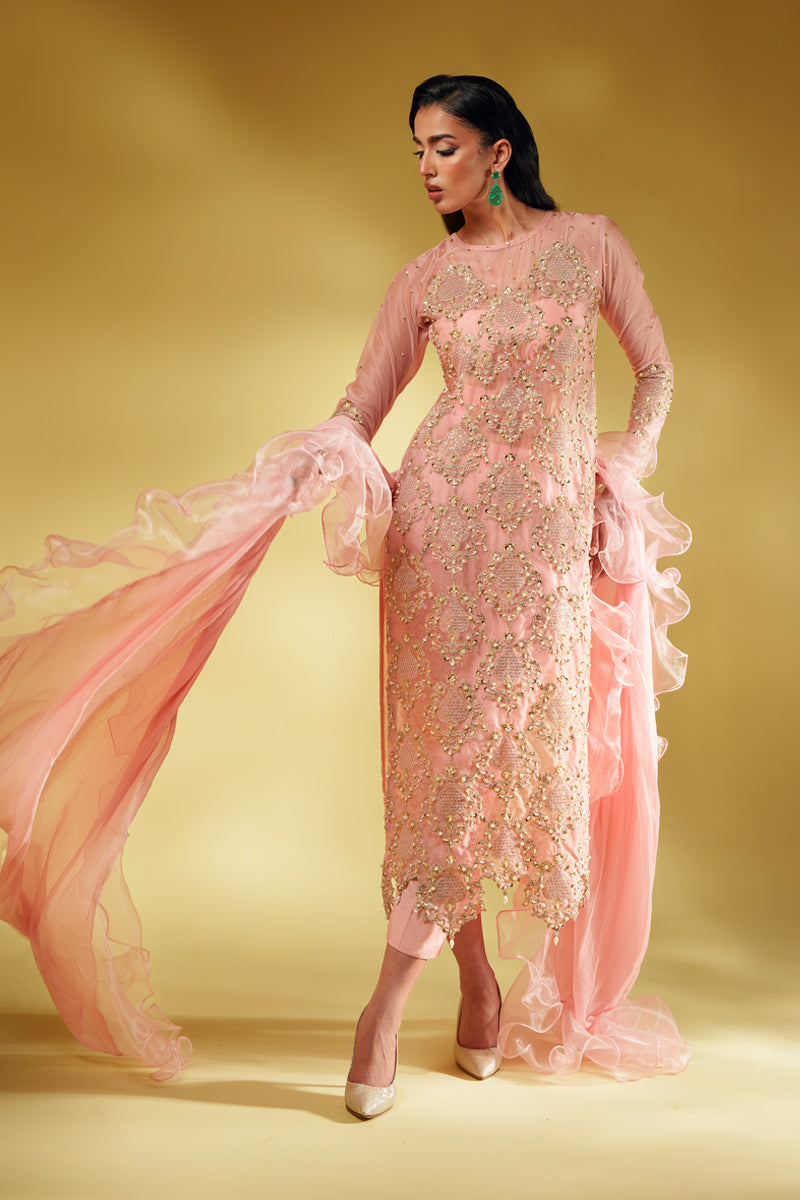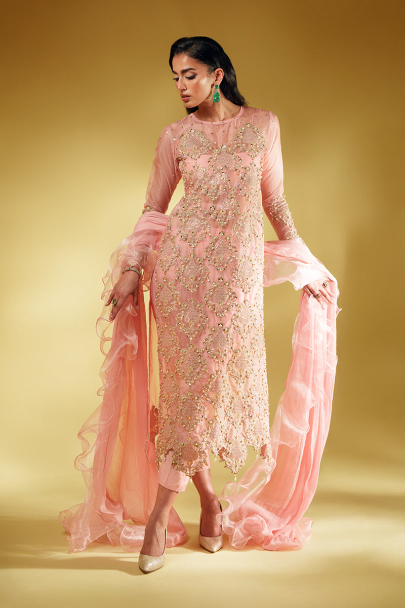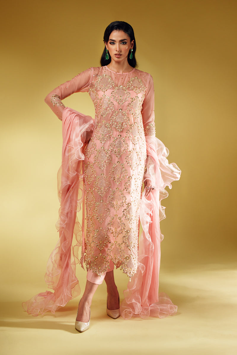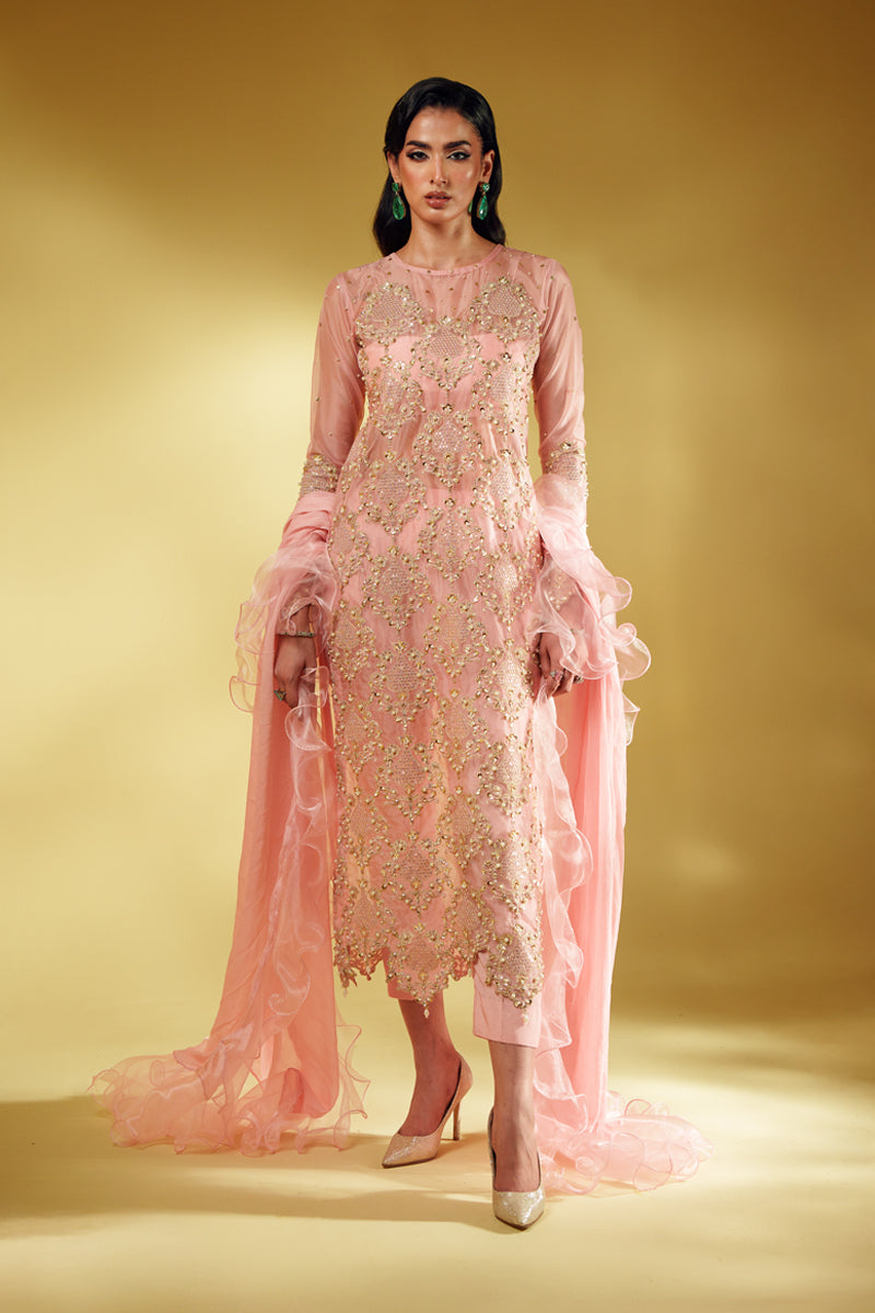 An ode to modern regality, Aveline is crafted in pure organza and drenched in golden tilla embroidery, brought to life with lavish handwork of sequins and pearls. The silhouette glows in a soft blush tone, exuding quiet strength and undeniable luxury. Every detail is thoughtfully crafted to reflect a royal essence, while the ensemble can be delivered with full lining for ease and elegance. The dupatta—fluid, ethereal, and unapologetically dramatic—adds the final stroke of artistry to this masterpiece.