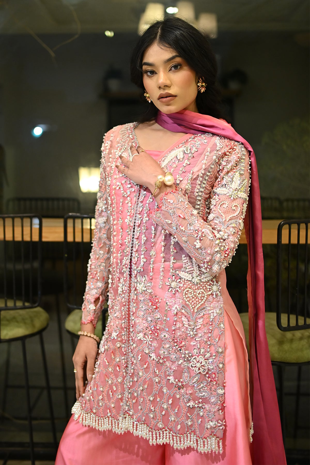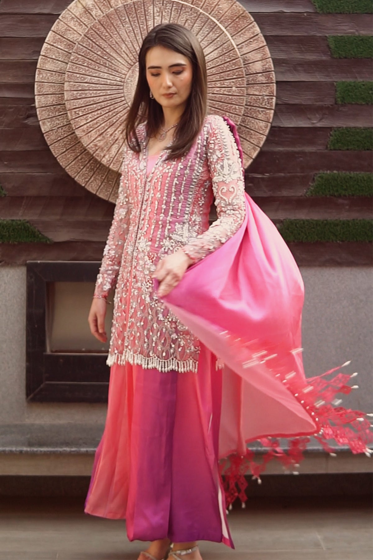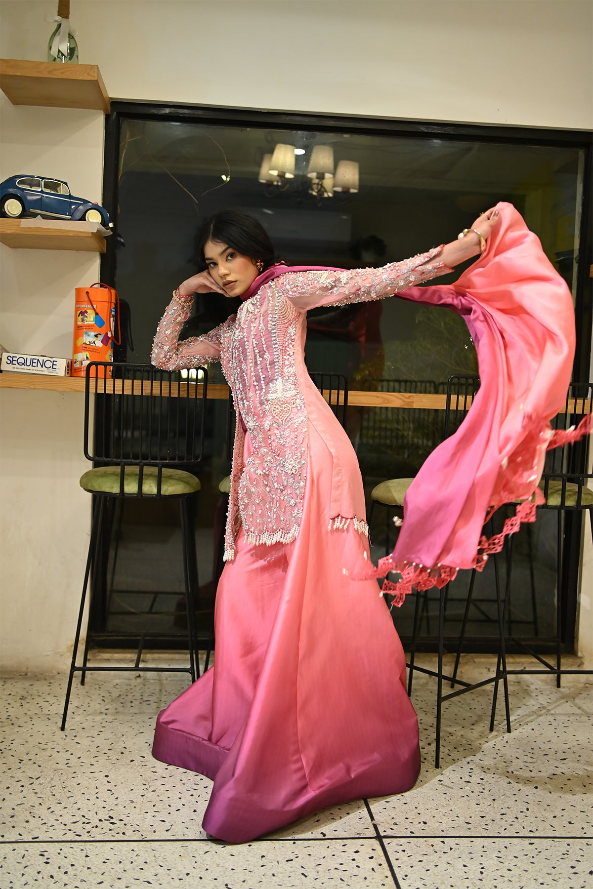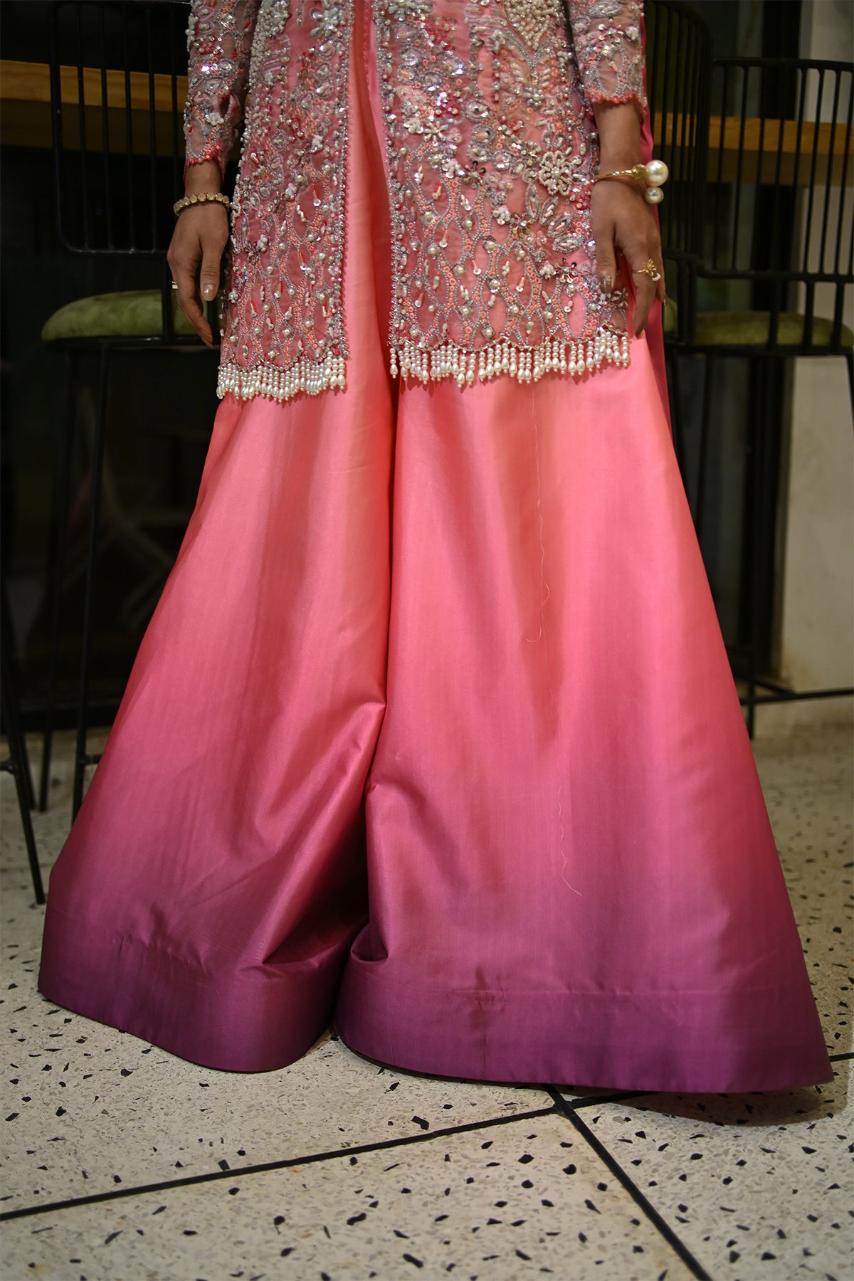 A periwinkle organza short shirt with V-neckline, embellished heavily, fitted sleeves, embroidery in tones of pink, chandi, tilla, silver, finished with details on the boarders Shirt with draped sarree end with tie and dye effect that blends the tones of pink effortlessly. Soft pastel pink ensemble with a fresh, feminine appeal Straight-cut silhouette enhanced with fine detailing throughout Silk draped trousers creating a fluid, graceful fall Subtle contrast between the sheer organza and lustrous silk Lightweight, airy construction ideal for festive and formal wear A polished look that blends modern draping with traditional craftsmanship No visibility of stomach or deep neckline to the customer piece, Layered underneath.