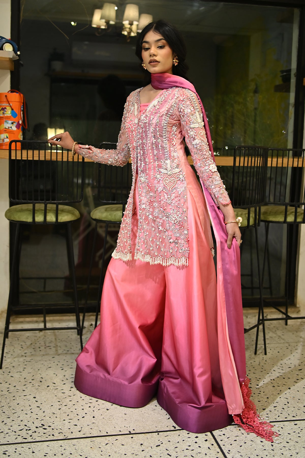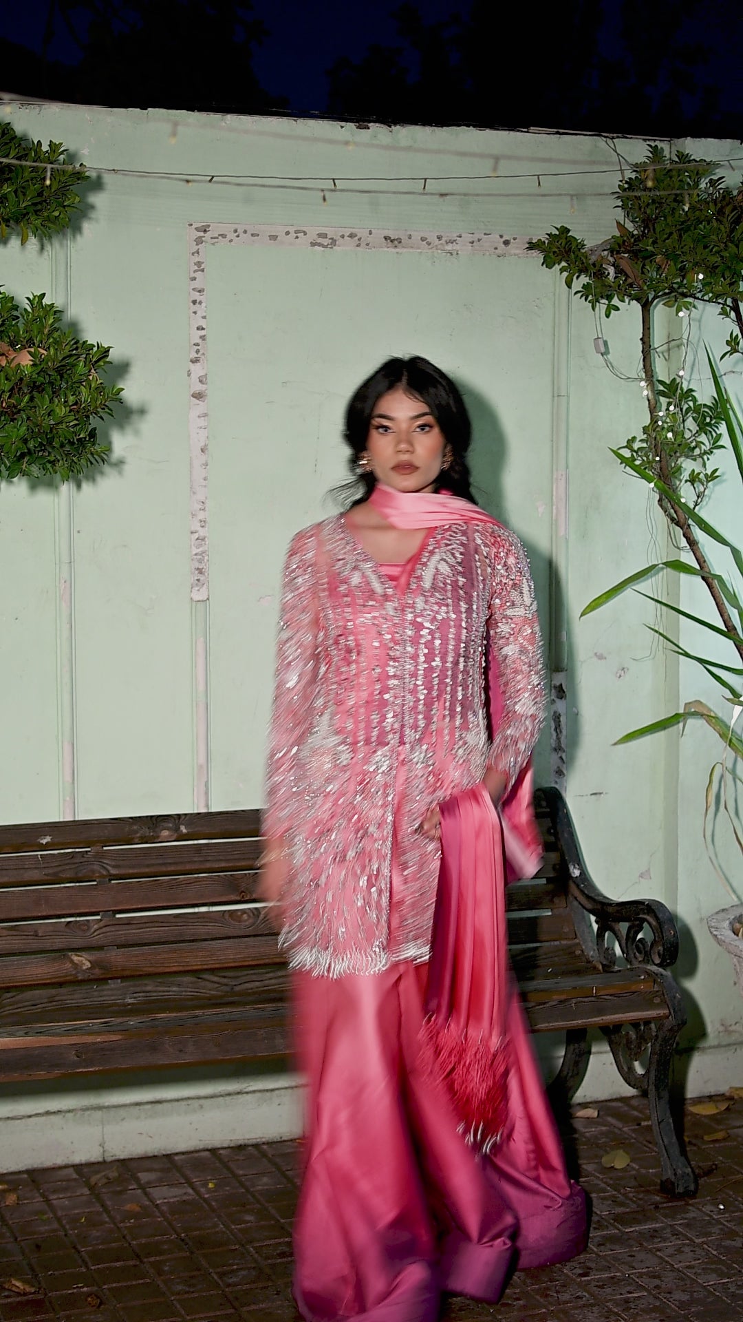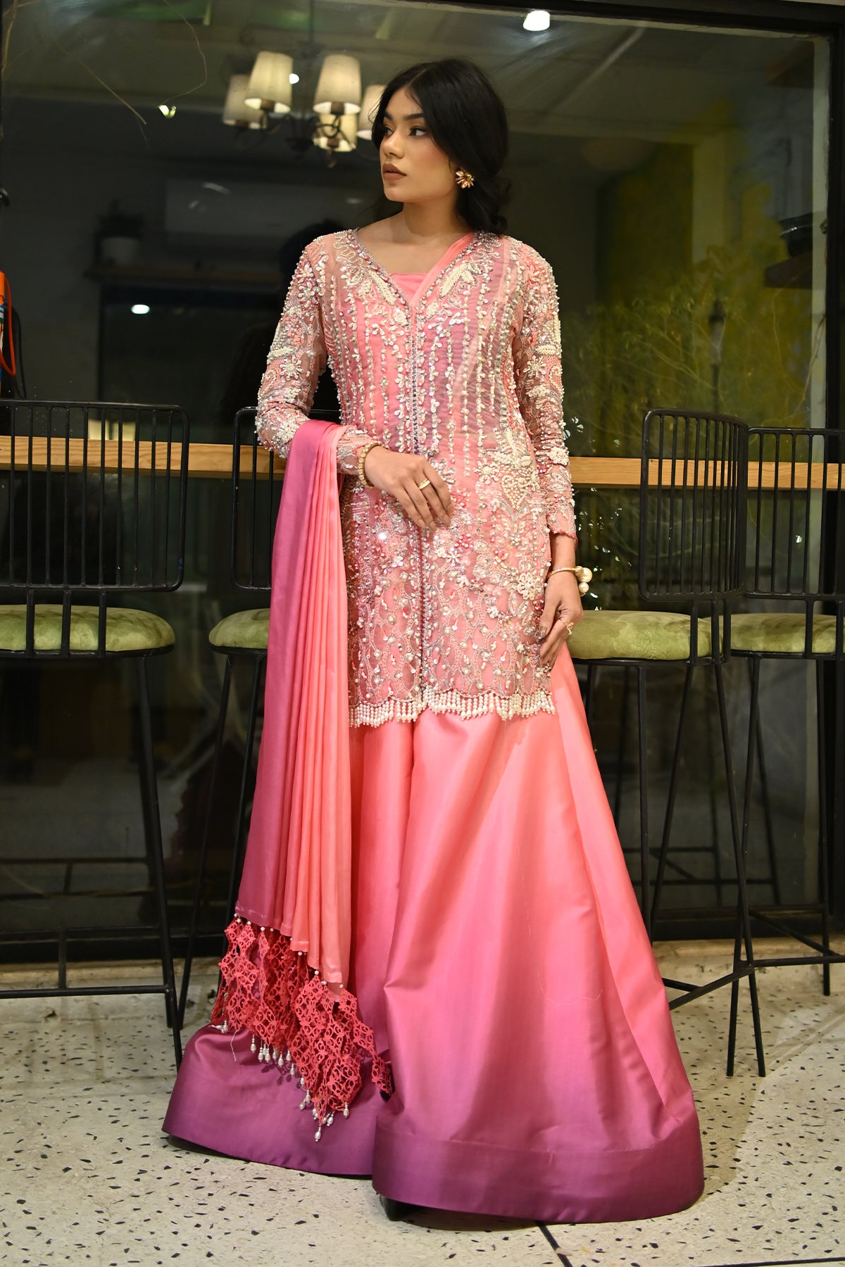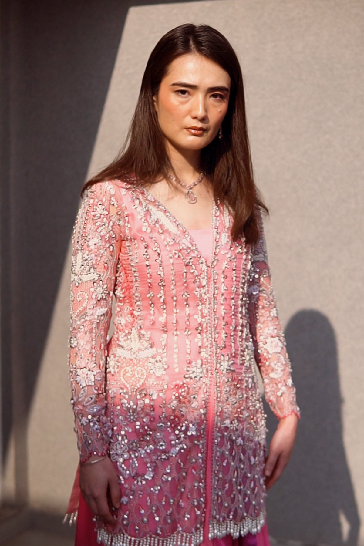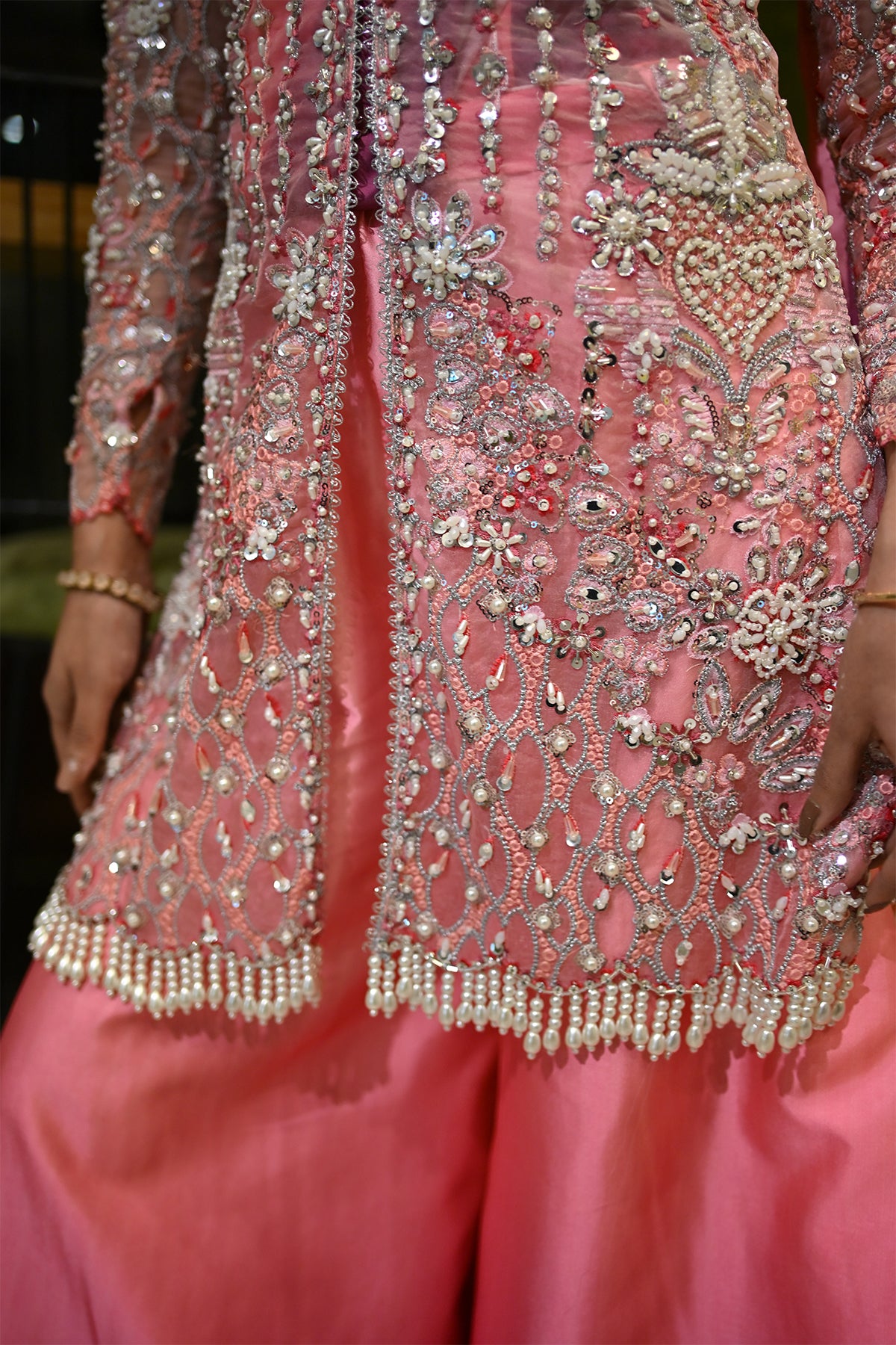 A periwinkle organza short shirt with V-neckline, embellished heavily, fitted sleeves, embroidery in tones of pink, chandi, tilla, silver, finished with details on the boarders Shirt with draped sarree end with tie and dye effect that blends the tones of pink effortlessly. Soft pastel pink ensemble with a fresh, feminine appeal Straight-cut silhouette enhanced with fine detailing throughout Silk draped trousers creating a fluid, graceful fall Subtle contrast between the sheer organza and lustrous silk Lightweight, airy construction ideal for festive and formal wear A polished look that blends modern draping with traditional craftsmanship No visibility of stomach or deep neckline to the customer piece, Layered underneath.