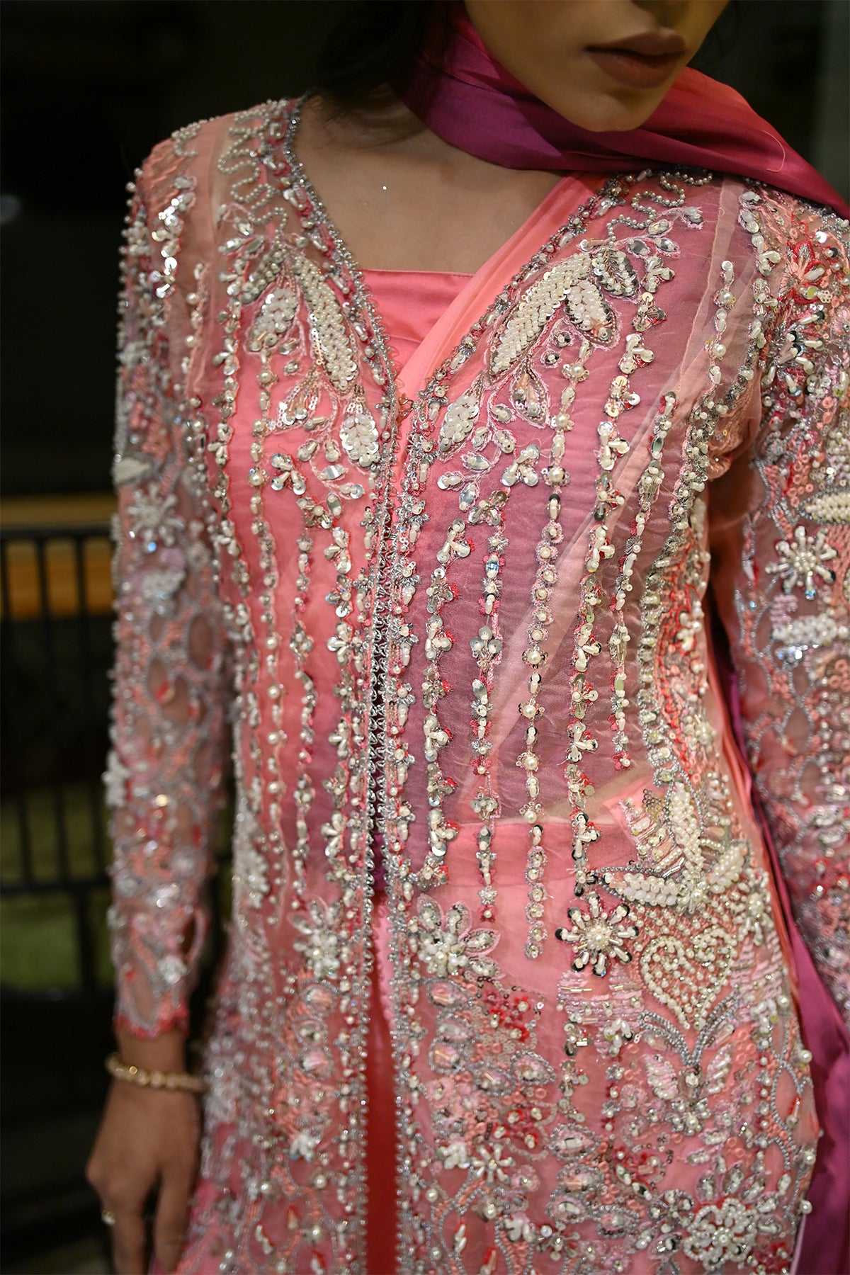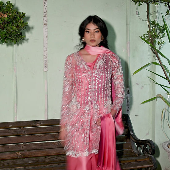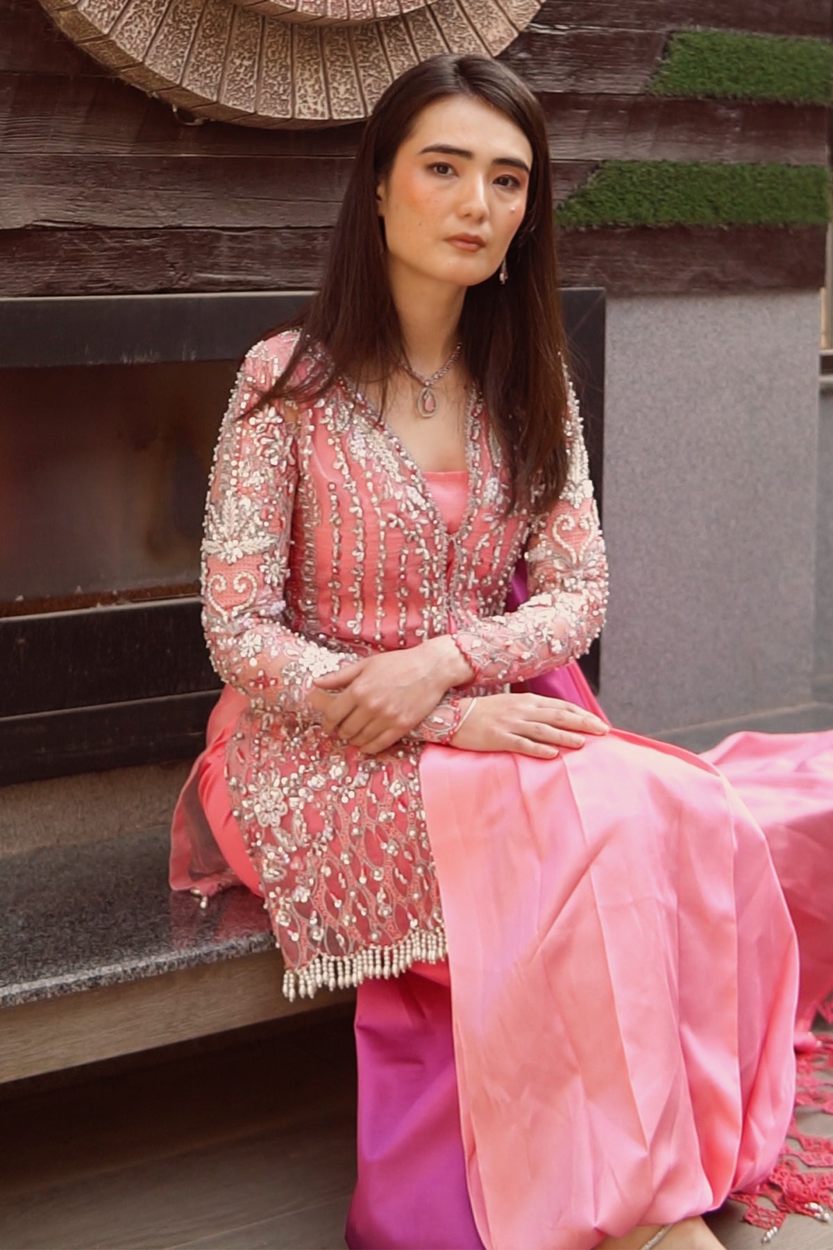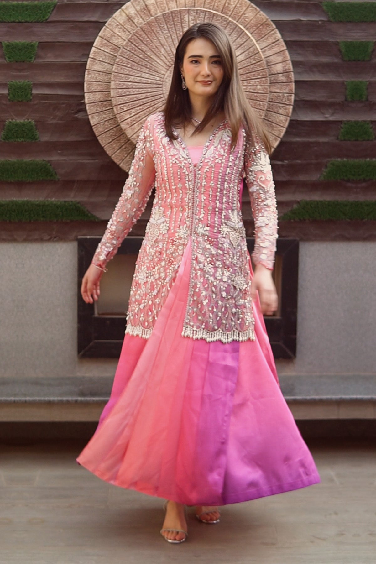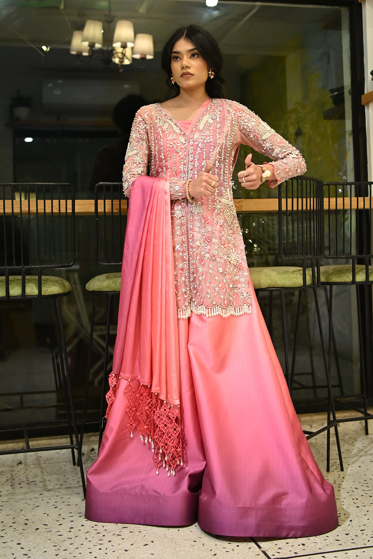 A periwinkle organza short shirt with V-neckline, embellished heavily, fitted sleeves, embroidery in tones of pink, chandi, tilla, silver, finished with details on the boarders Shirt with draped sarree end with tie and dye effect that blends the tones of pink effortlessly. Soft pastel pink ensemble with a fresh, feminine appeal Straight-cut silhouette enhanced with fine detailing throughout Silk draped trousers creating a fluid, graceful fall Subtle contrast between the sheer organza and lustrous silk Lightweight, airy construction ideal for festive and formal wear A polished look that blends modern draping with traditional craftsmanship No visibility of stomach or deep neckline to the customer piece, Layered underneath.