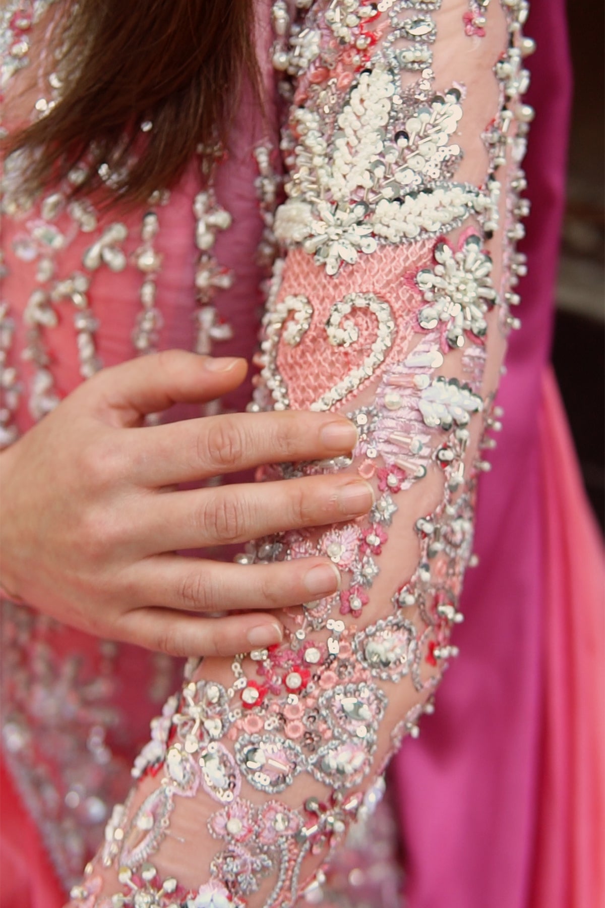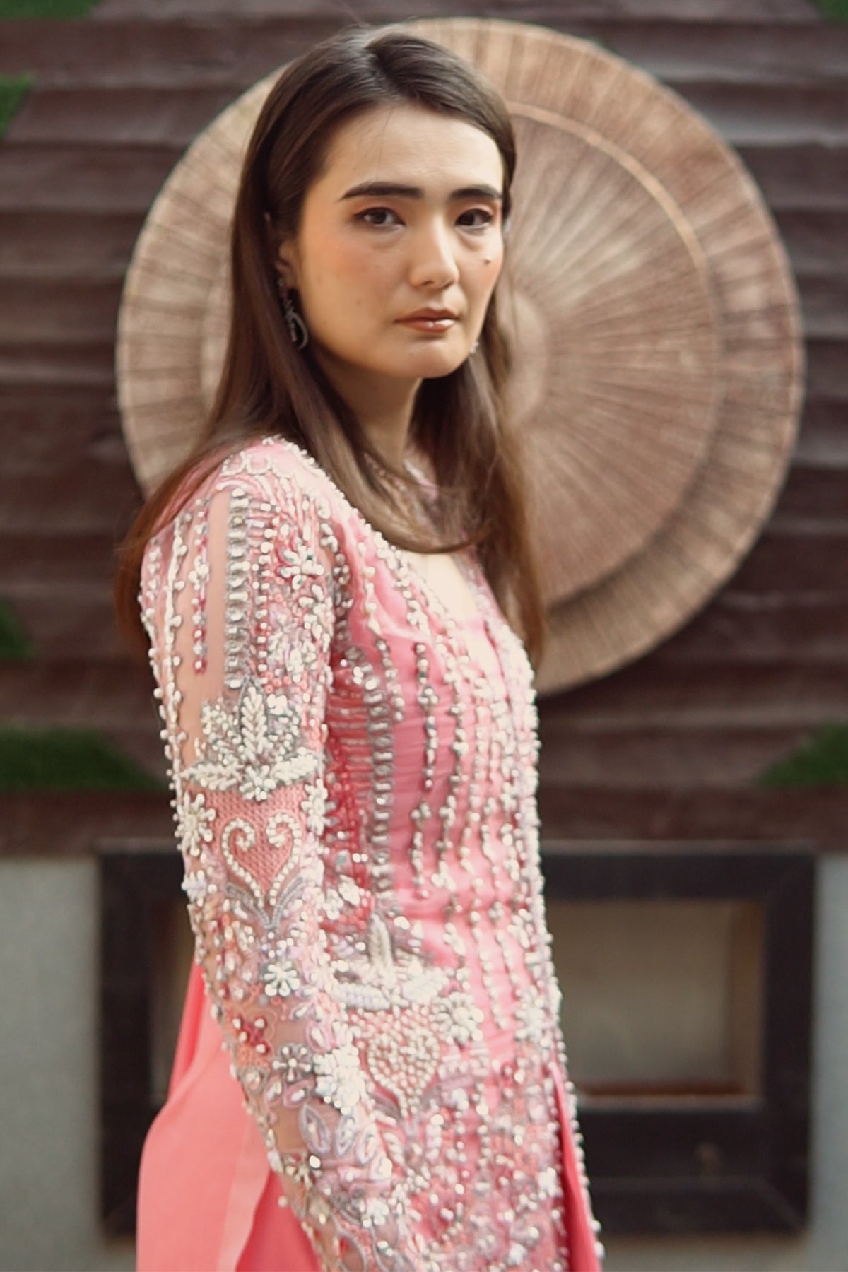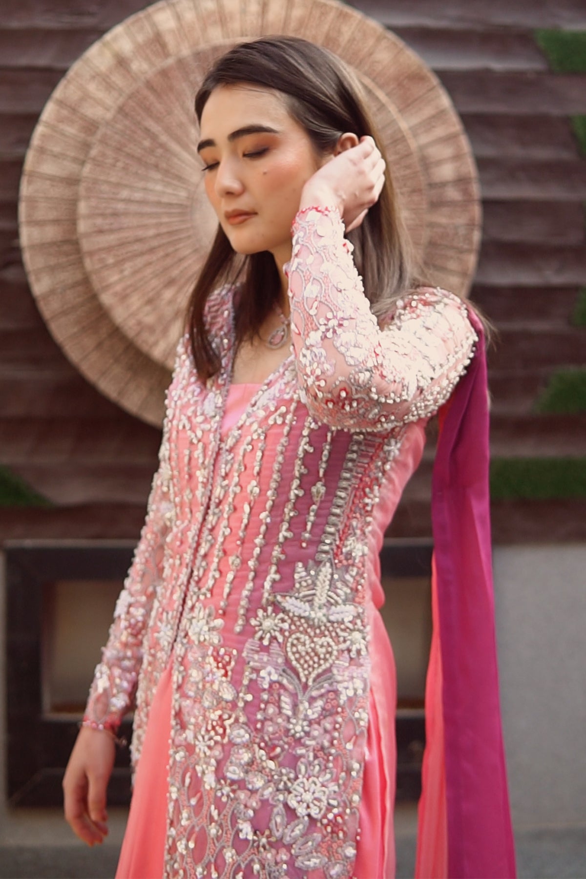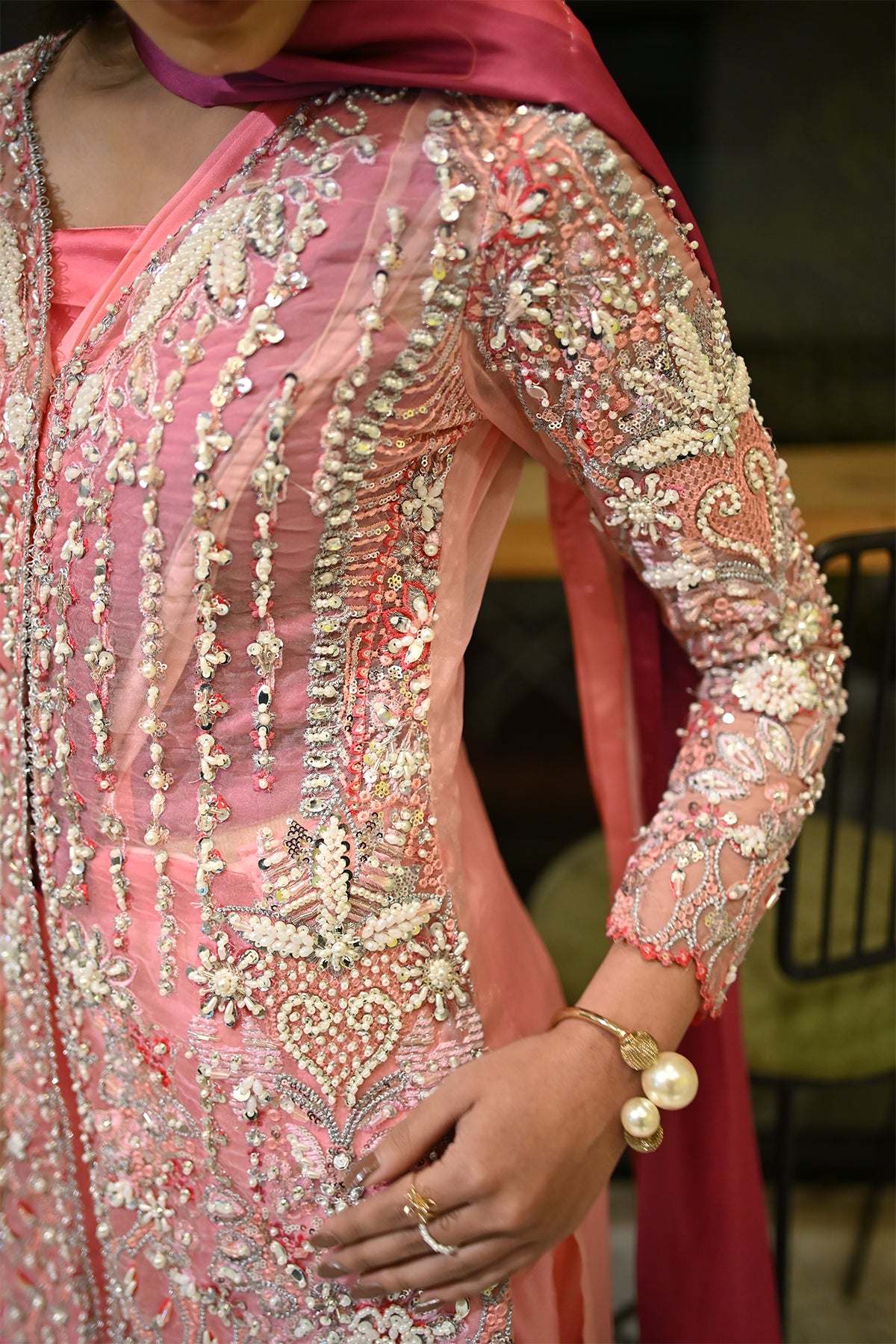 A periwinkle organza short shirt with V-neckline, embellished heavily, fitted sleeves, embroidery in tones of pink, chandi, tilla, silver, finished with details on the boarders Shirt with draped sarree end with tie and dye effect that blends the tones of pink effortlessly. Soft pastel pink ensemble with a fresh, feminine appeal Straight-cut silhouette enhanced with fine detailing throughout Silk draped trousers creating a fluid, graceful fall Subtle contrast between the sheer organza and lustrous silk Lightweight, airy construction ideal for festive and formal wear A polished look that blends modern draping with traditional craftsmanship No visibility of stomach or deep neckline to the customer piece, Layered underneath.