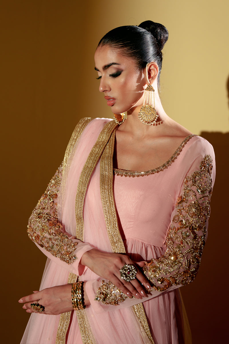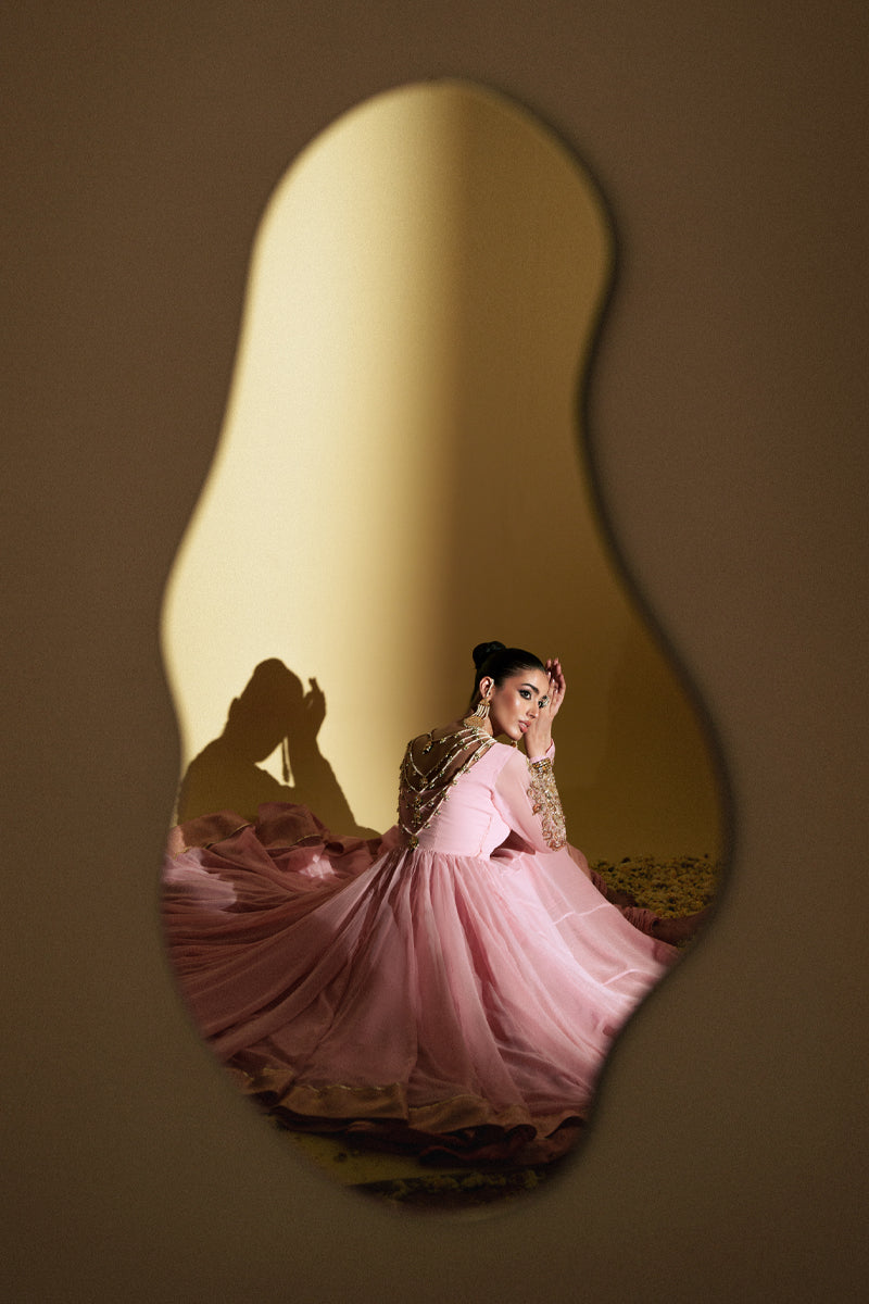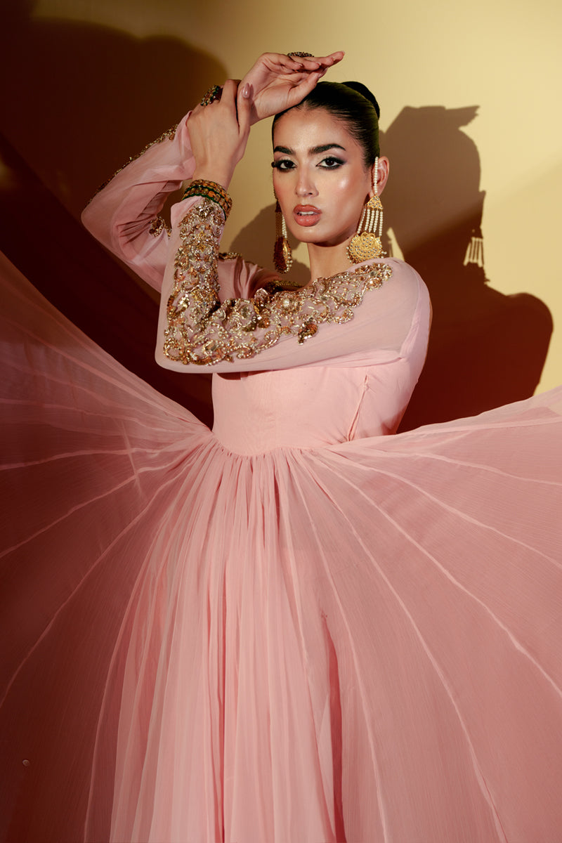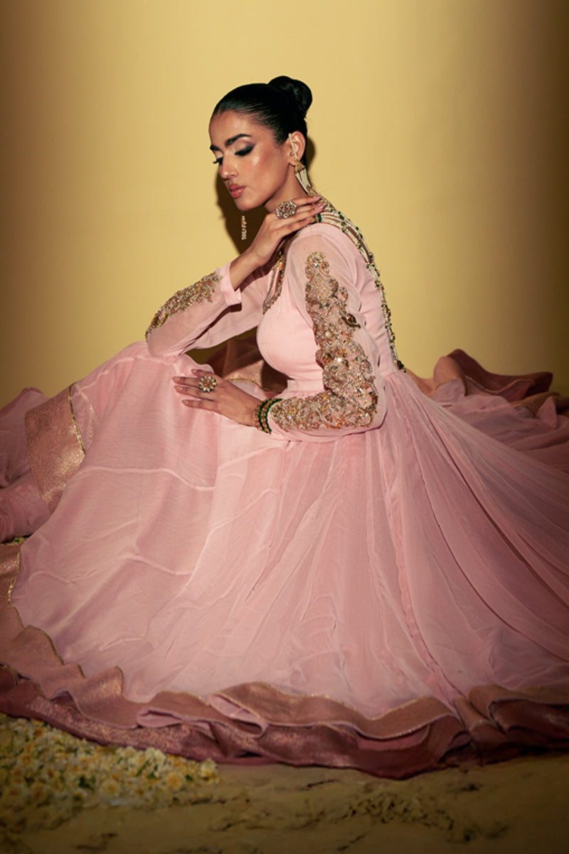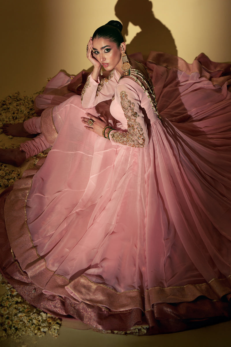 Crafted from the ethereal elegance of Chiffon Chanderi, Élara is a two-toned pink pishwas that redefines graceful grandeur. Its sweeping, giant flare stuns only when worn — flowing like poetry in motion. The intricate bodice and sleeves are adorned with luxurious handwork: pearls, sequins, dabka, and naqshi, each placed with reverence. Paired with a kadda dupatta, heavily bordered and glistening with traditional accents, this ensemble is designed to leave a lasting impression — regal, romantic, and unapologetically feminine.
