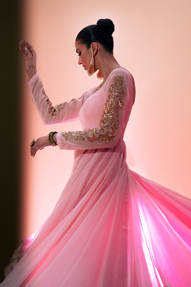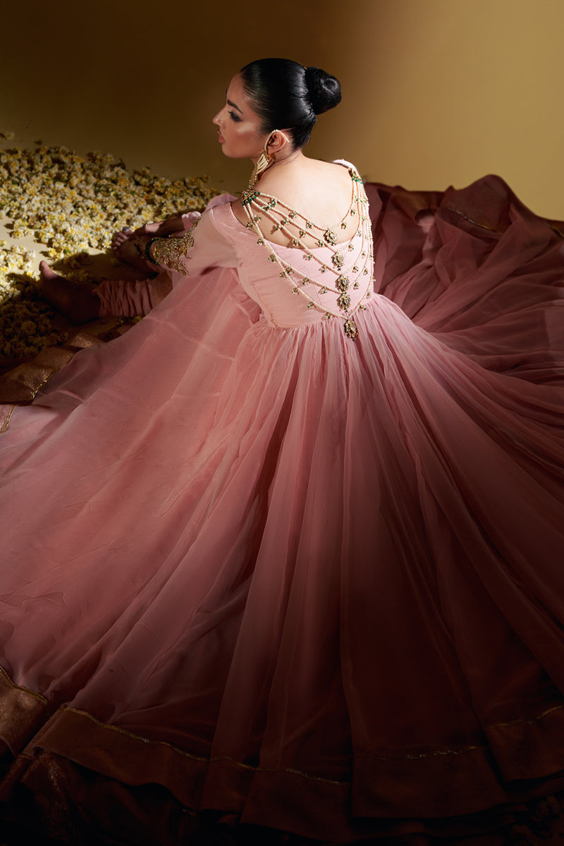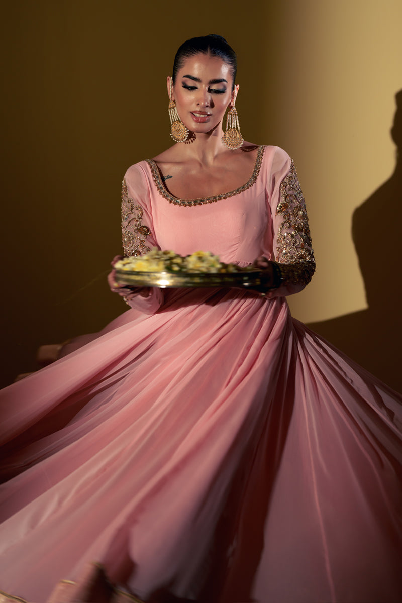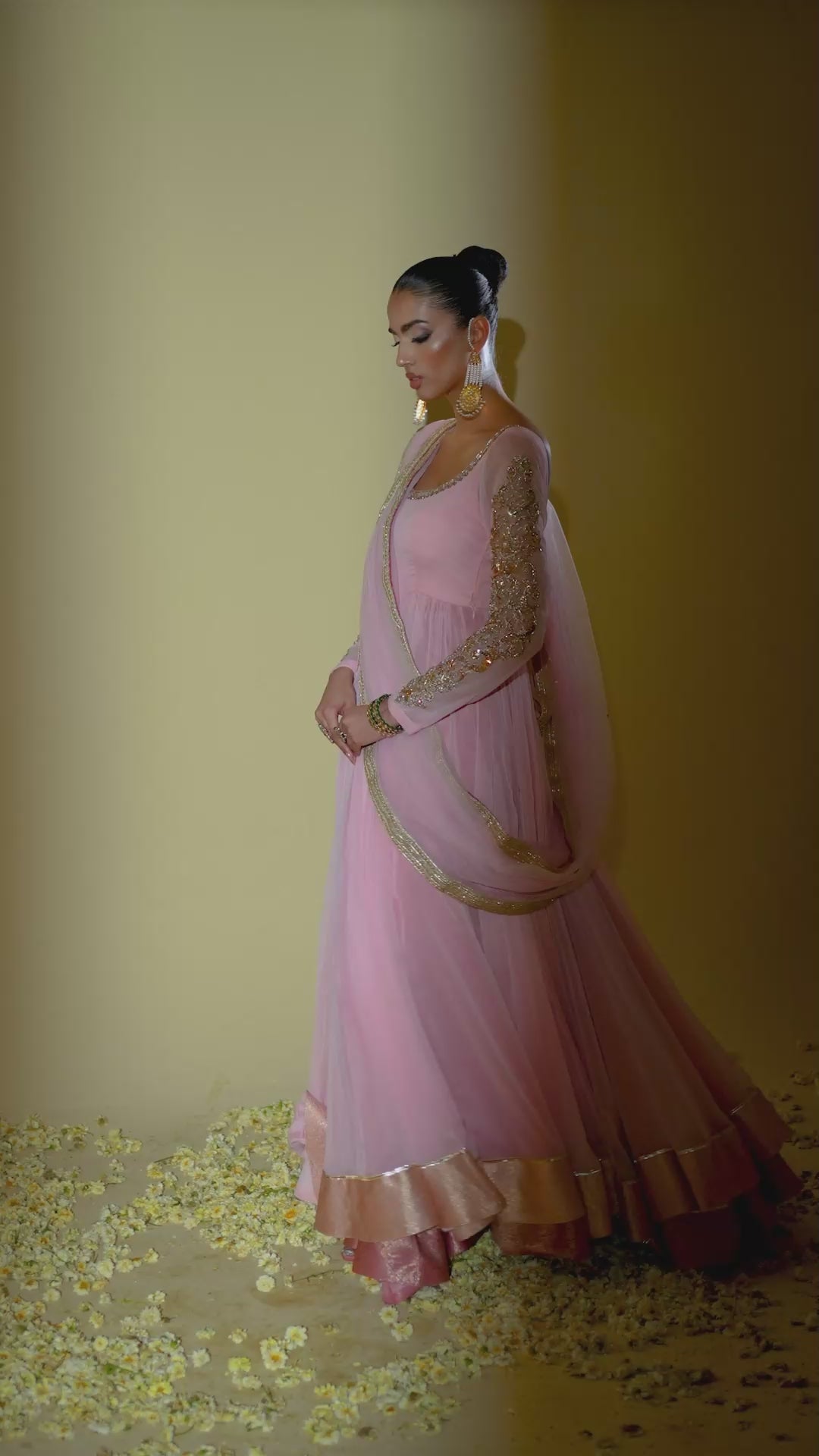 Crafted from the ethereal elegance of Chiffon Chanderi, Élara is a two-toned pink pishwas that redefines graceful grandeur. Its sweeping, giant flare stuns only when worn — flowing like poetry in motion. The intricate bodice and sleeves are adorned with luxurious handwork: pearls, sequins, dabka, and naqshi, each placed with reverence. Paired with a kadda dupatta, heavily bordered and glistening with traditional accents, this ensemble is designed to leave a lasting impression — regal, romantic, and unapologetically feminine.