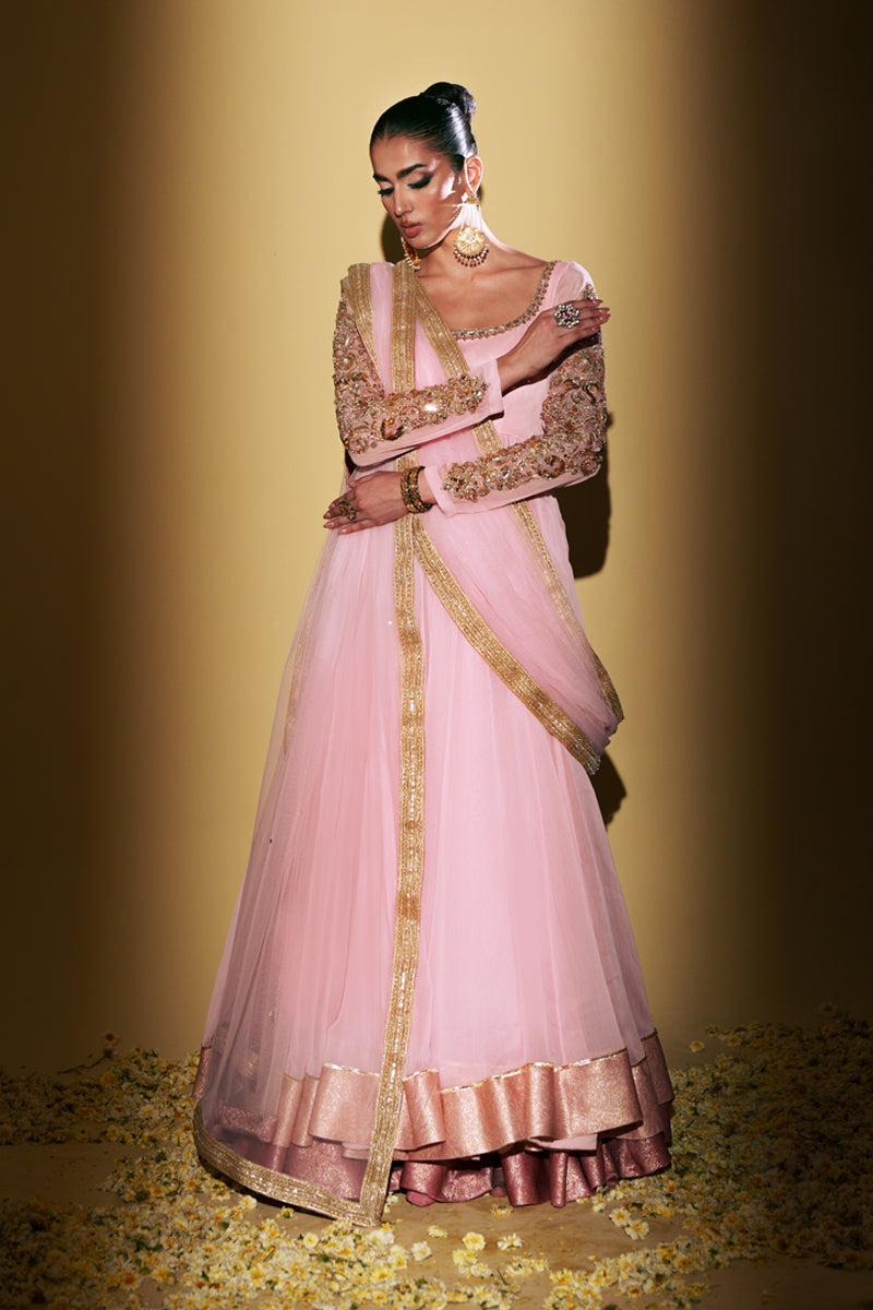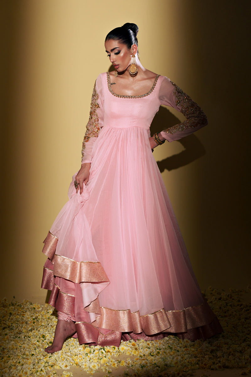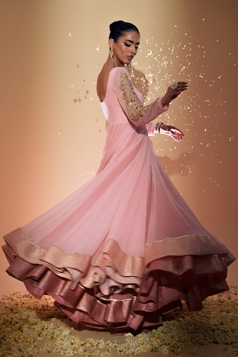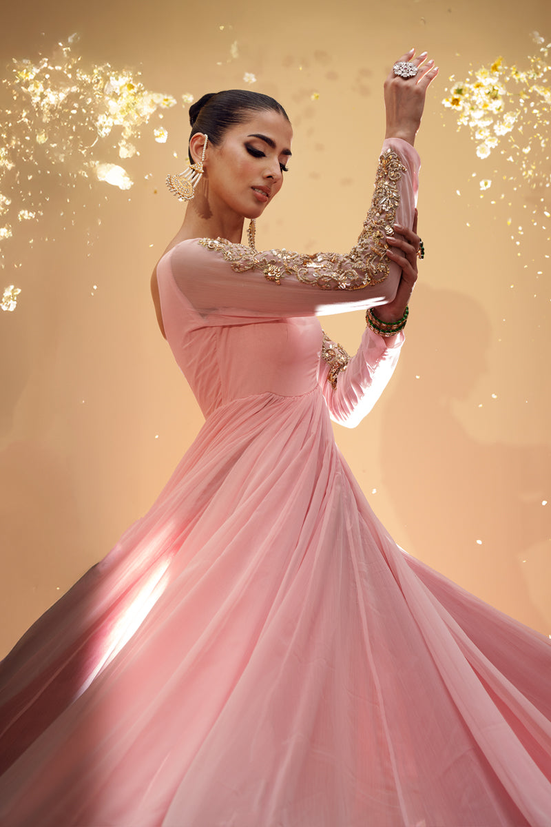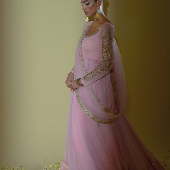 Crafted from the ethereal elegance of Chiffon Chanderi, Élara is a two-toned pink pishwas that redefines graceful grandeur. Its sweeping, giant flare stuns only when worn — flowing like poetry in motion. The intricate bodice and sleeves are adorned with luxurious handwork: pearls, sequins, dabka, and naqshi, each placed with reverence. Paired with a kadda dupatta, heavily bordered and glistening with traditional accents, this ensemble is designed to leave a lasting impression — regal, romantic, and unapologetically feminine.