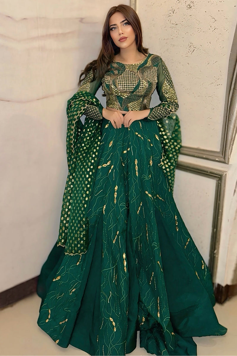 This stunning ensemble, crafted from rich Korean silk, features a voluminous green lehenga adorned with intricate golden embroidery. The fluid, wave-like patterns across the fabric create a regal, yet contemporary look, evoking movement and grace with every step. The blouse, made from delicate organza, offers a modern twist with its sheer sleeves and geometric metallic hand embellishments, adding a touch of sophistication and grandeur. Paired together, this outfit is perfect for the modern bride or fashion-forward guest, capturing both the opulence of tradition and the elegance of minimalist design. Ideal for weddings, festive celebrations with a chunri organza dupatta.