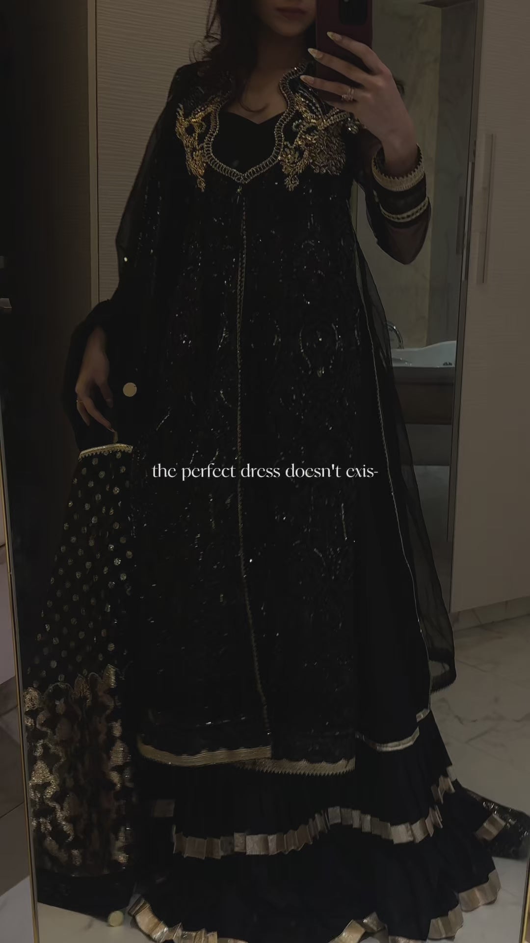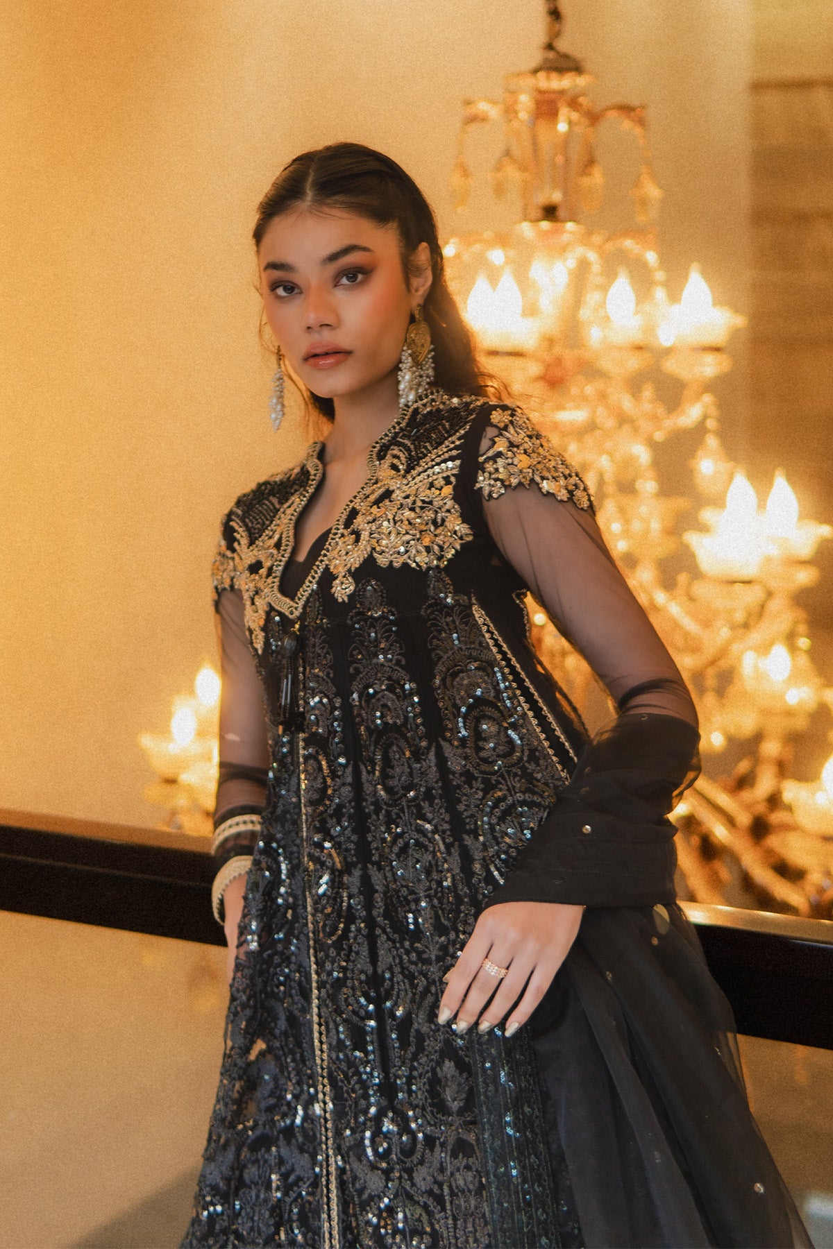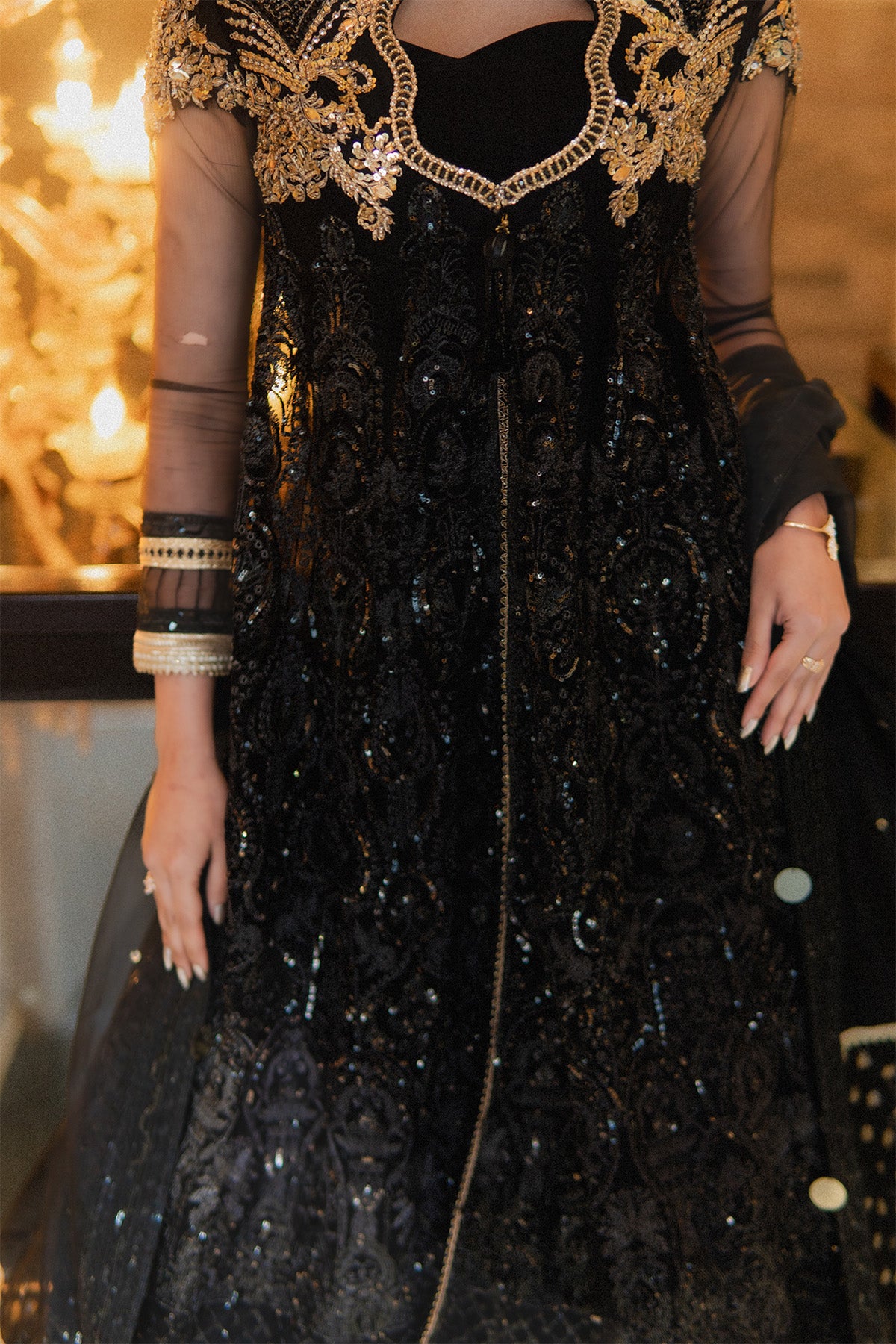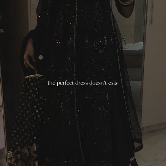 Deep black ensemble accented with rich gold embellishments Net shirt featuring intricate embroidery and detailed handwork Long, flowy kalidaar silhouette with graceful movement Deep V-neck highlighted with ornate gold embroidery Silk trousers designed with elegant pleats and finished with golden patti Sheer organza dupatta adorned with gold polka detailing and refined borders Layered hemline enhanced with pleats and gold trims A statement look ideal for weddings, festive occasions, and formal evenings No visibility of stomach to the customer piece, Layered underneath.