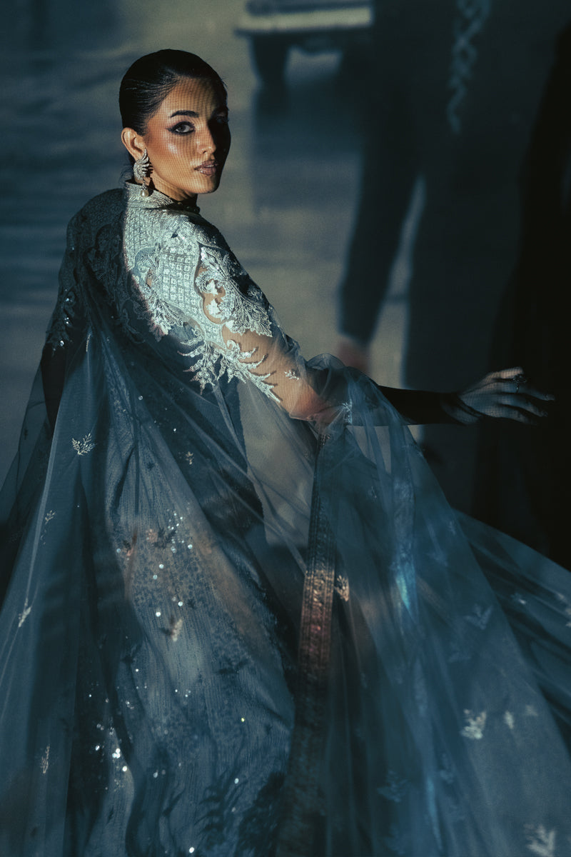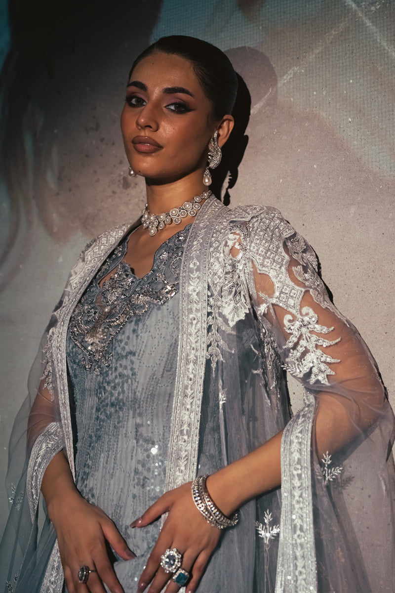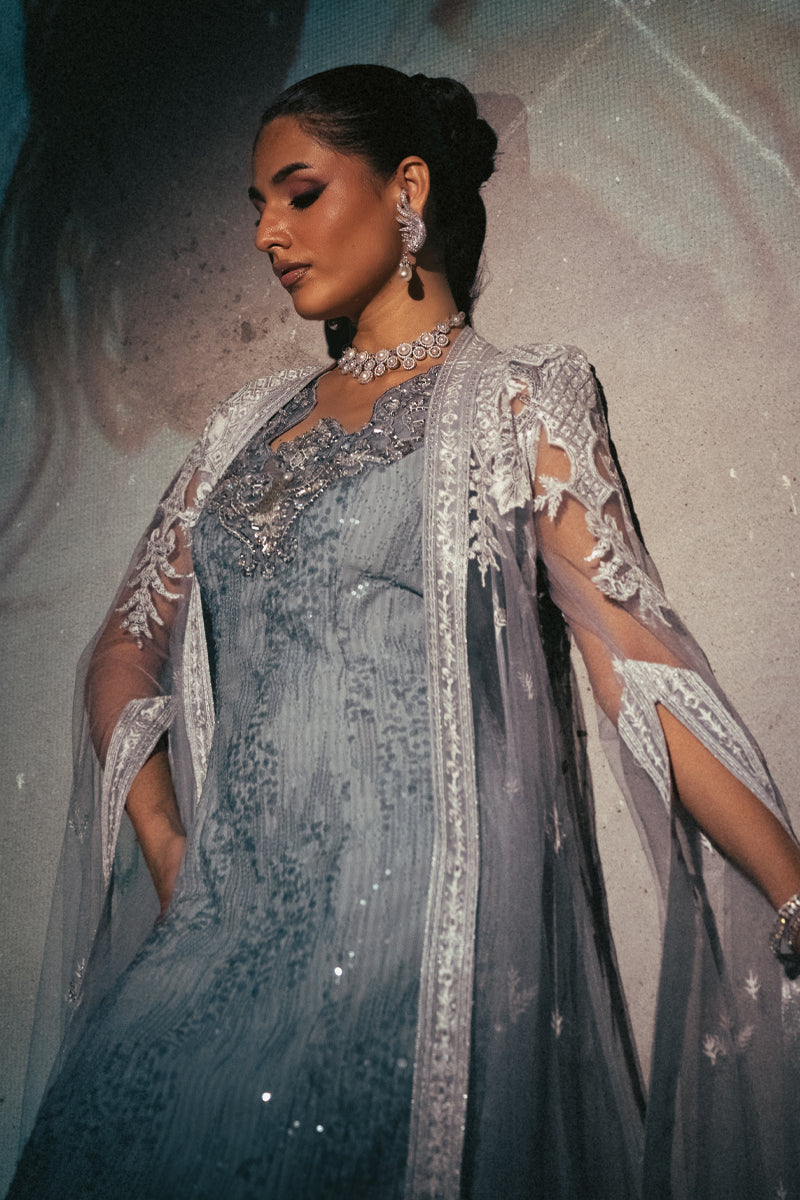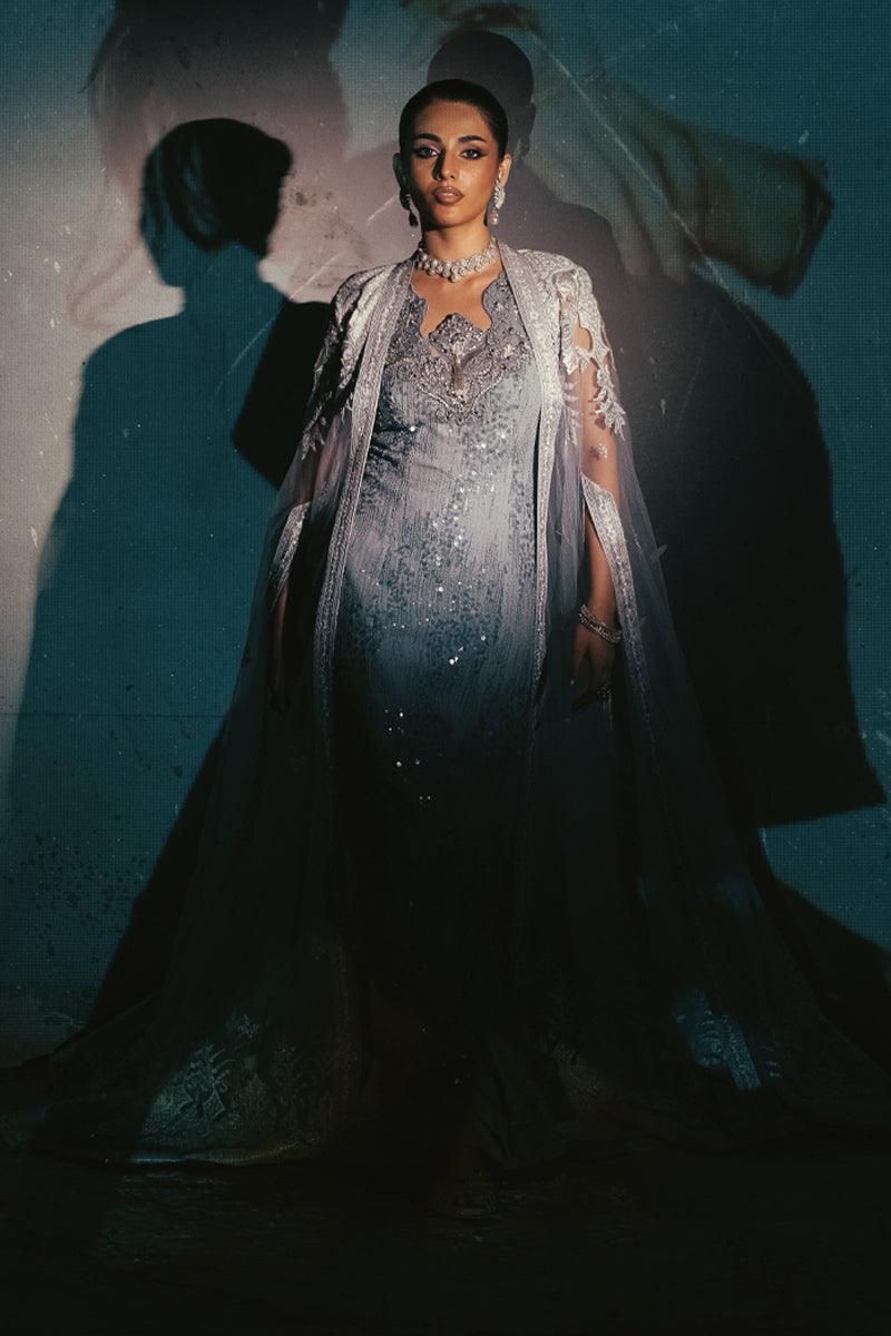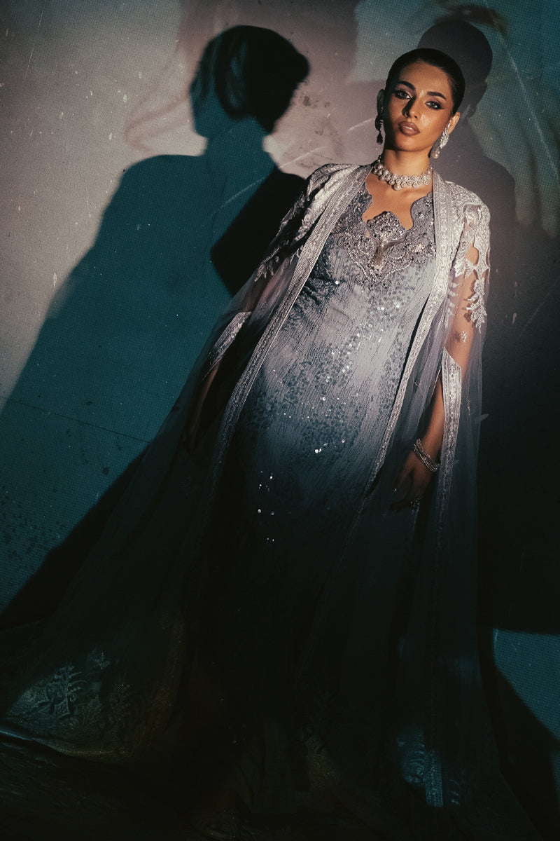 This ethereal silver ensemble features a sleek, embellished gown paired with a sheer, floor-length jacket adorned with delicate embroidery and sequins. The structured silhouette and intricate details exude modern elegance with a regal charm.