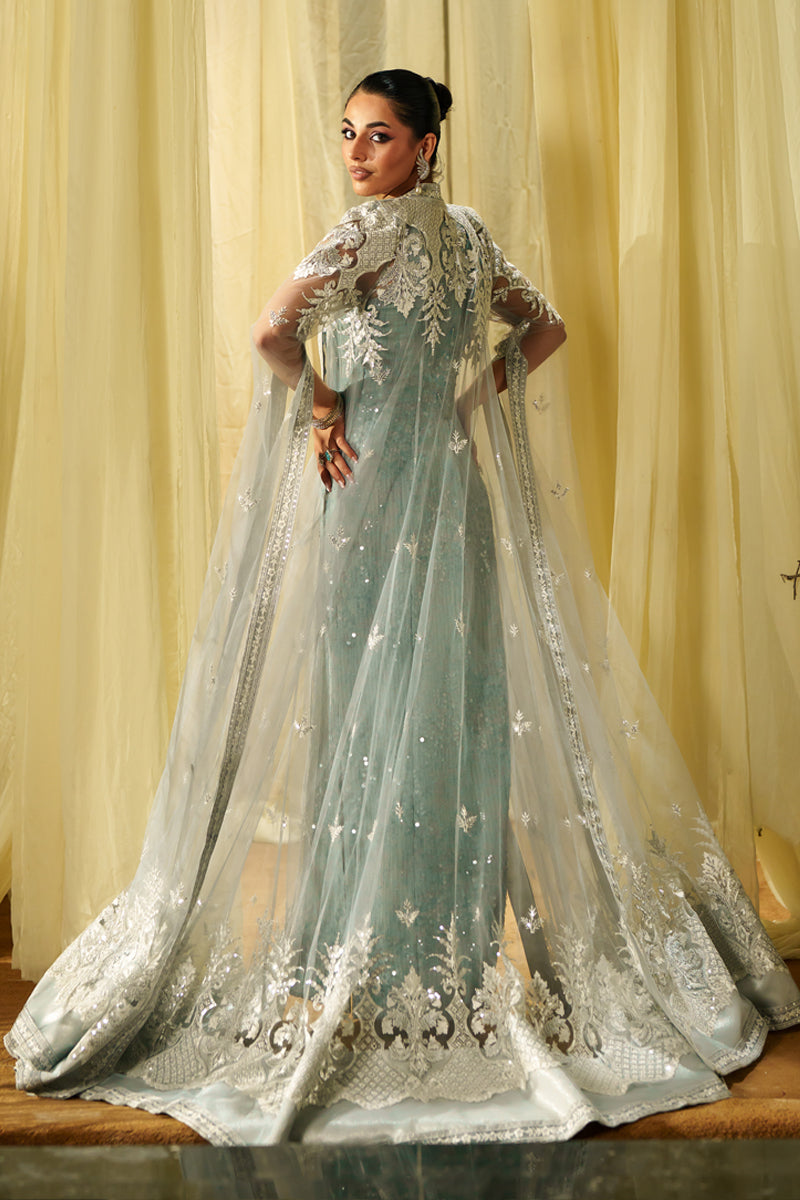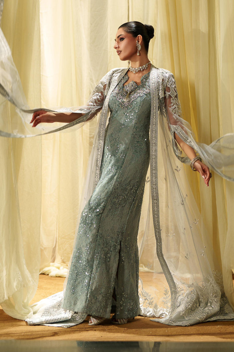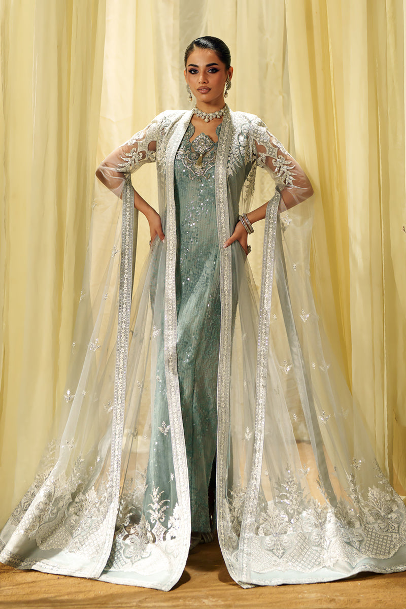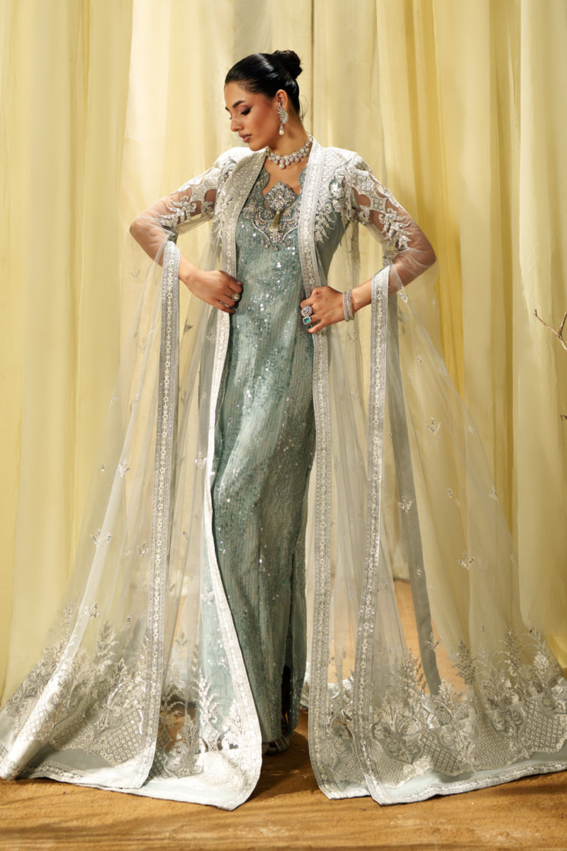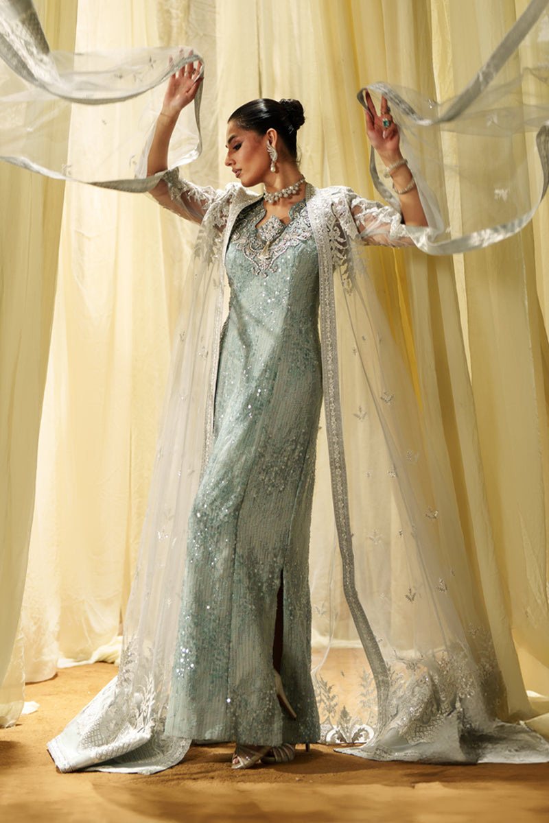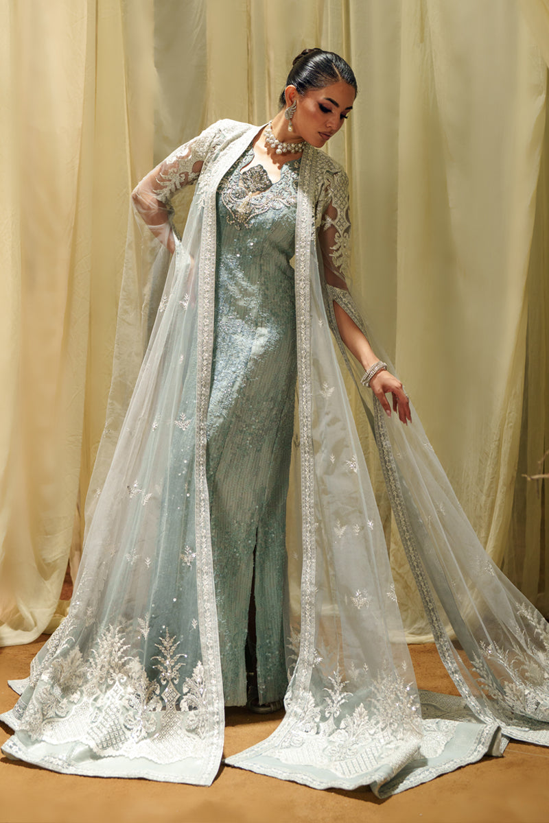 This ethereal silver ensemble features a sleek, embellished gown paired with a sheer, floor-length jacket adorned with delicate embroidery and sequins. The structured silhouette and intricate details exude modern elegance with a regal charm.