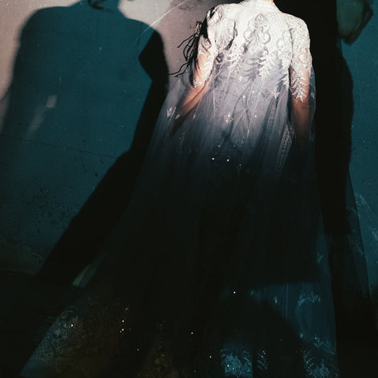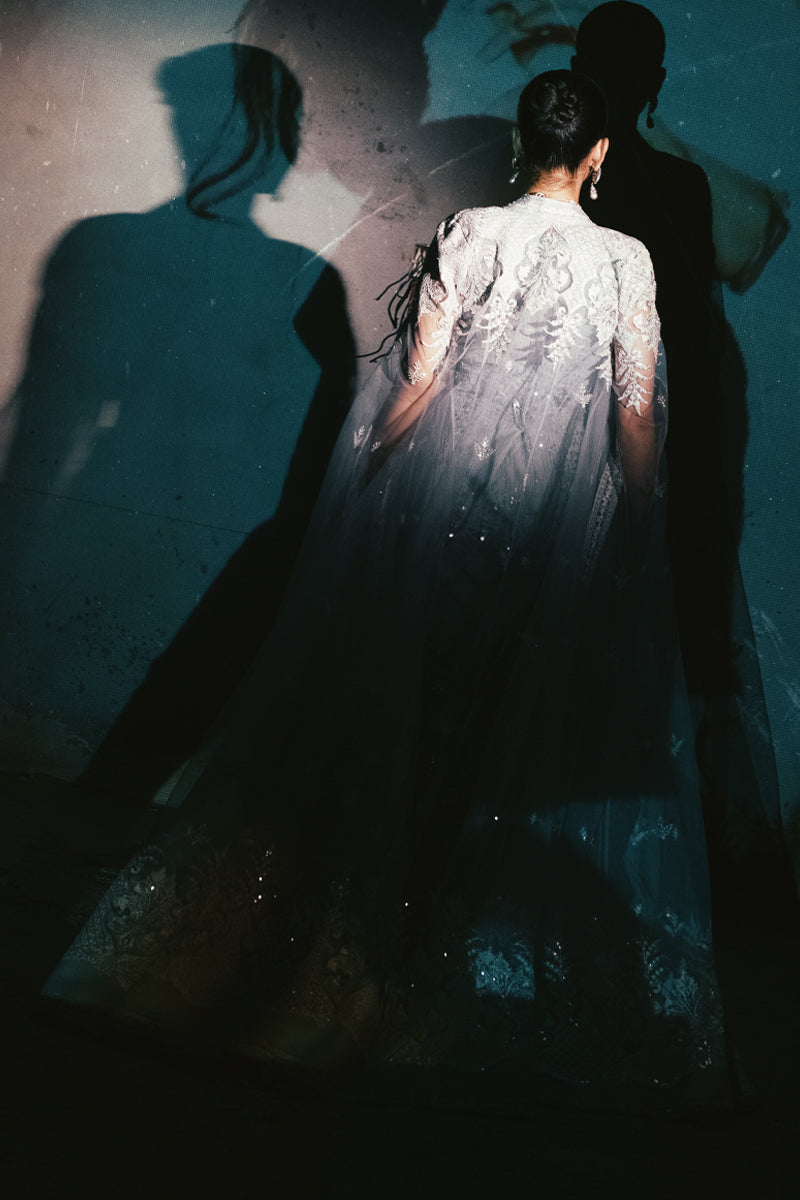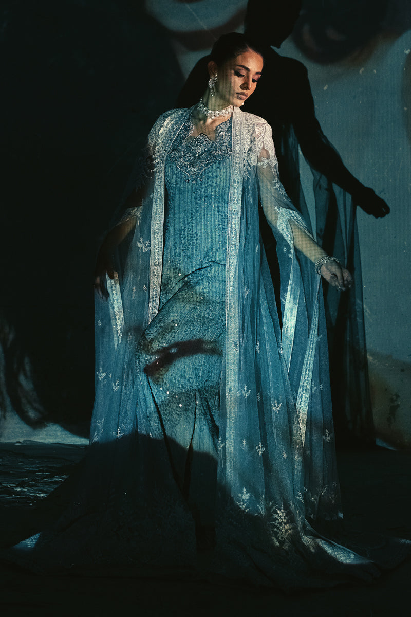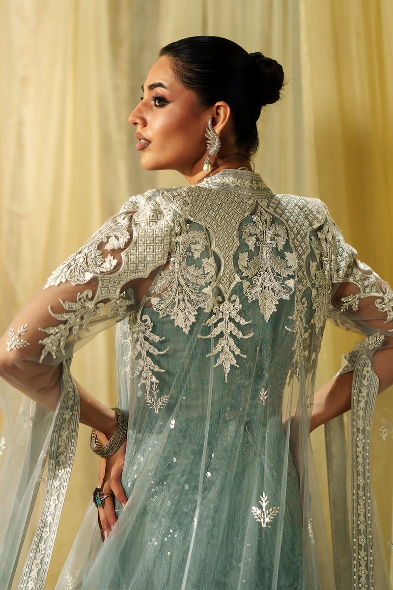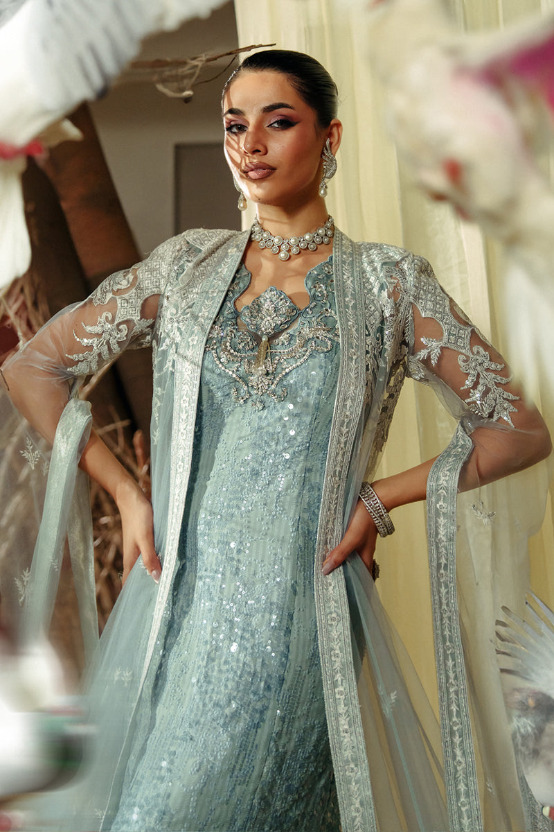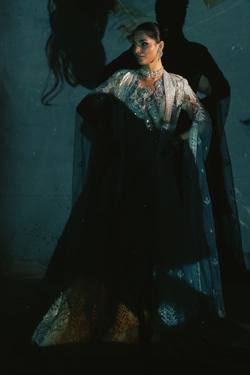 This ethereal silver ensemble features a sleek, embellished gown paired with a sheer, floor-length jacket adorned with delicate embroidery and sequins. The structured silhouette and intricate details exude modern elegance with a regal charm.
