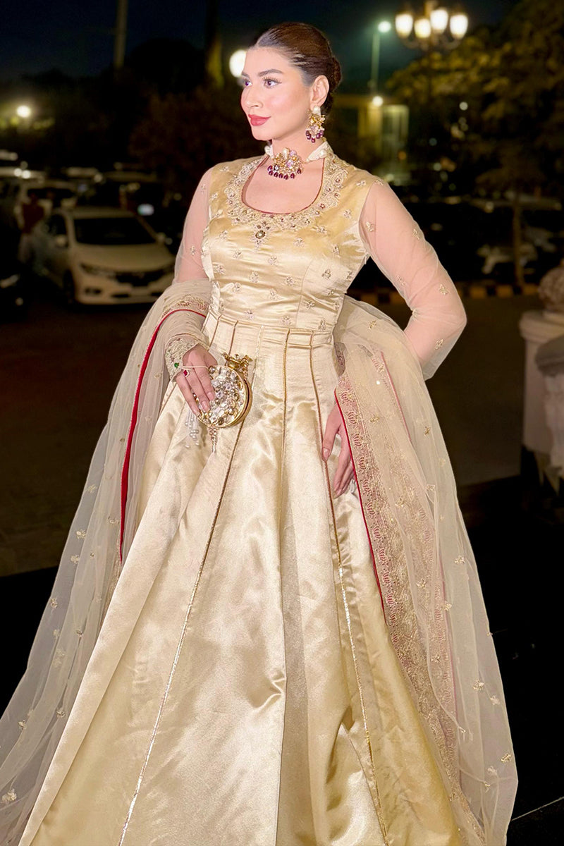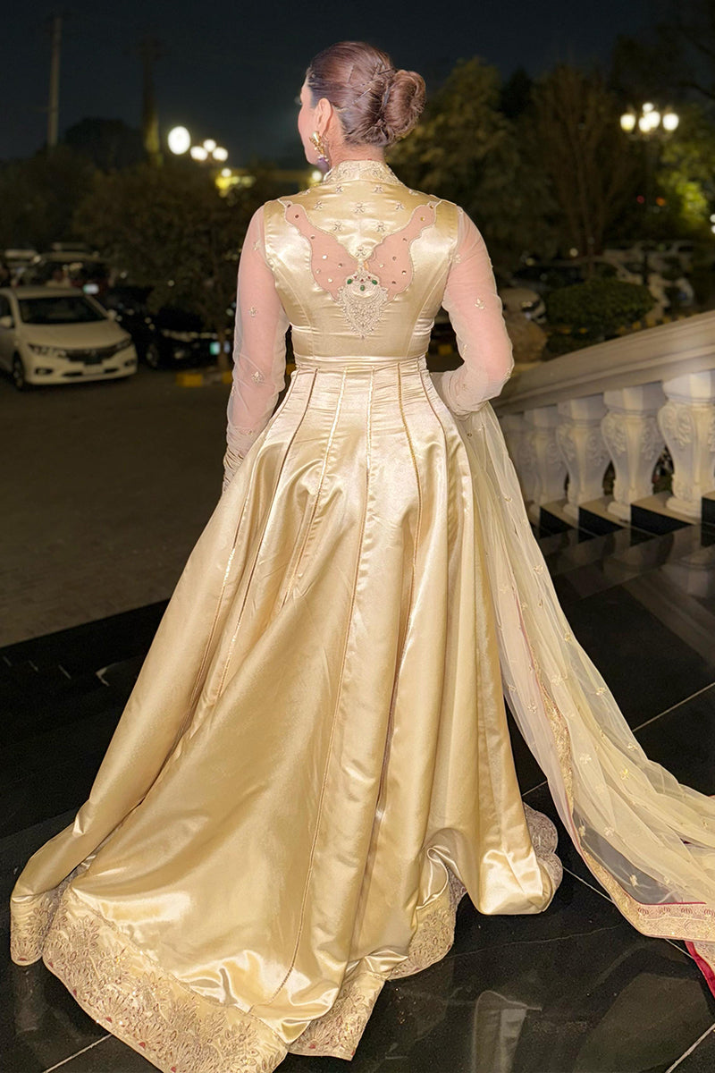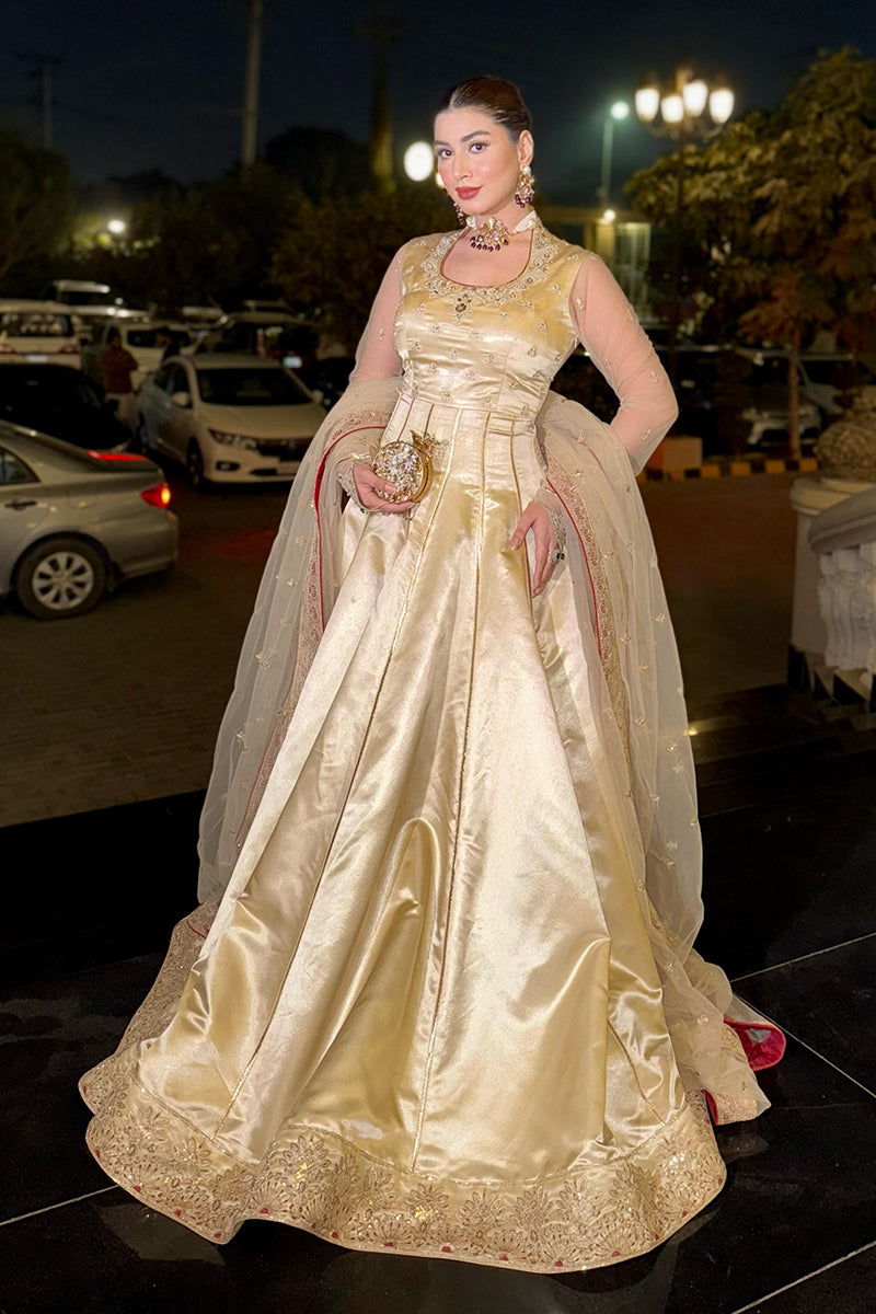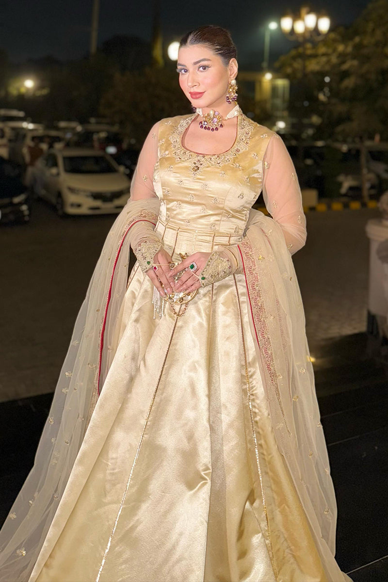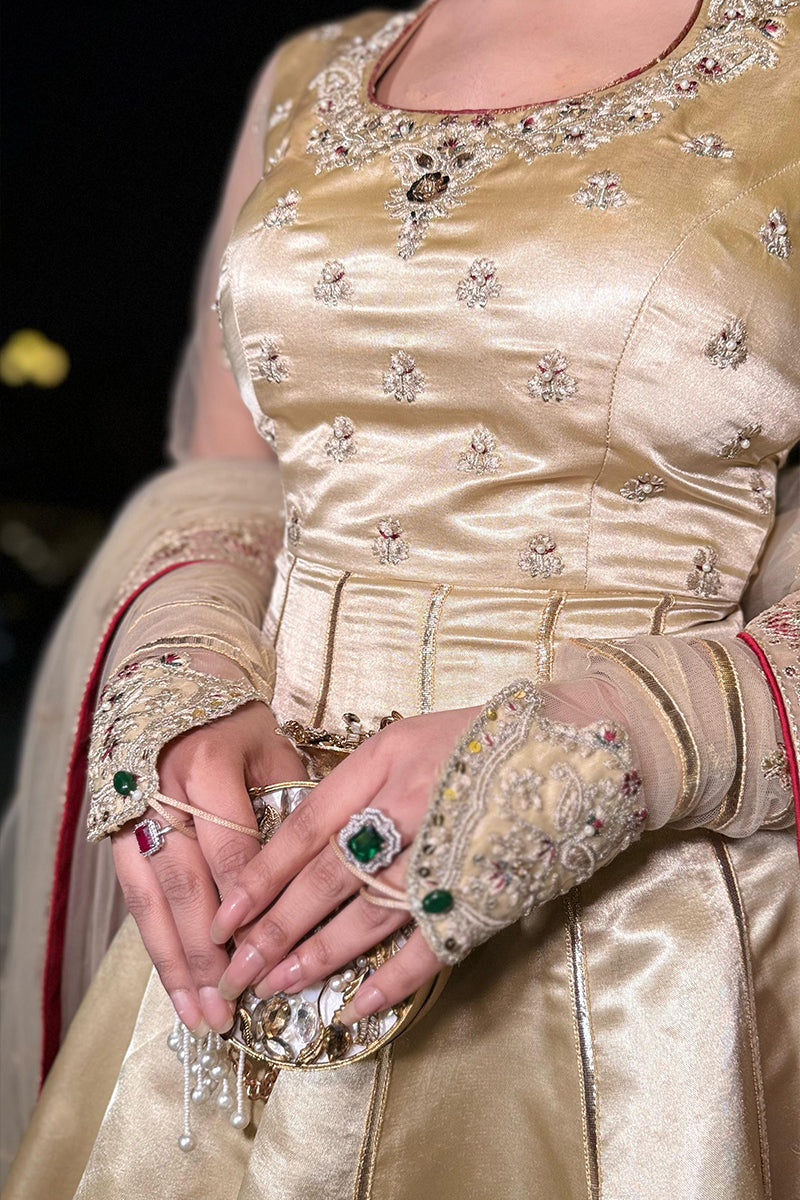 A timeless charmeuse silk pishwas with a magnificent royal flare, featuring delicate handwork on the neckline and an embroidered border at the hem. Paired with a heavily adorned net dupatta and intricate gotta detailing across the panels, this ensemble exudes regal elegance.