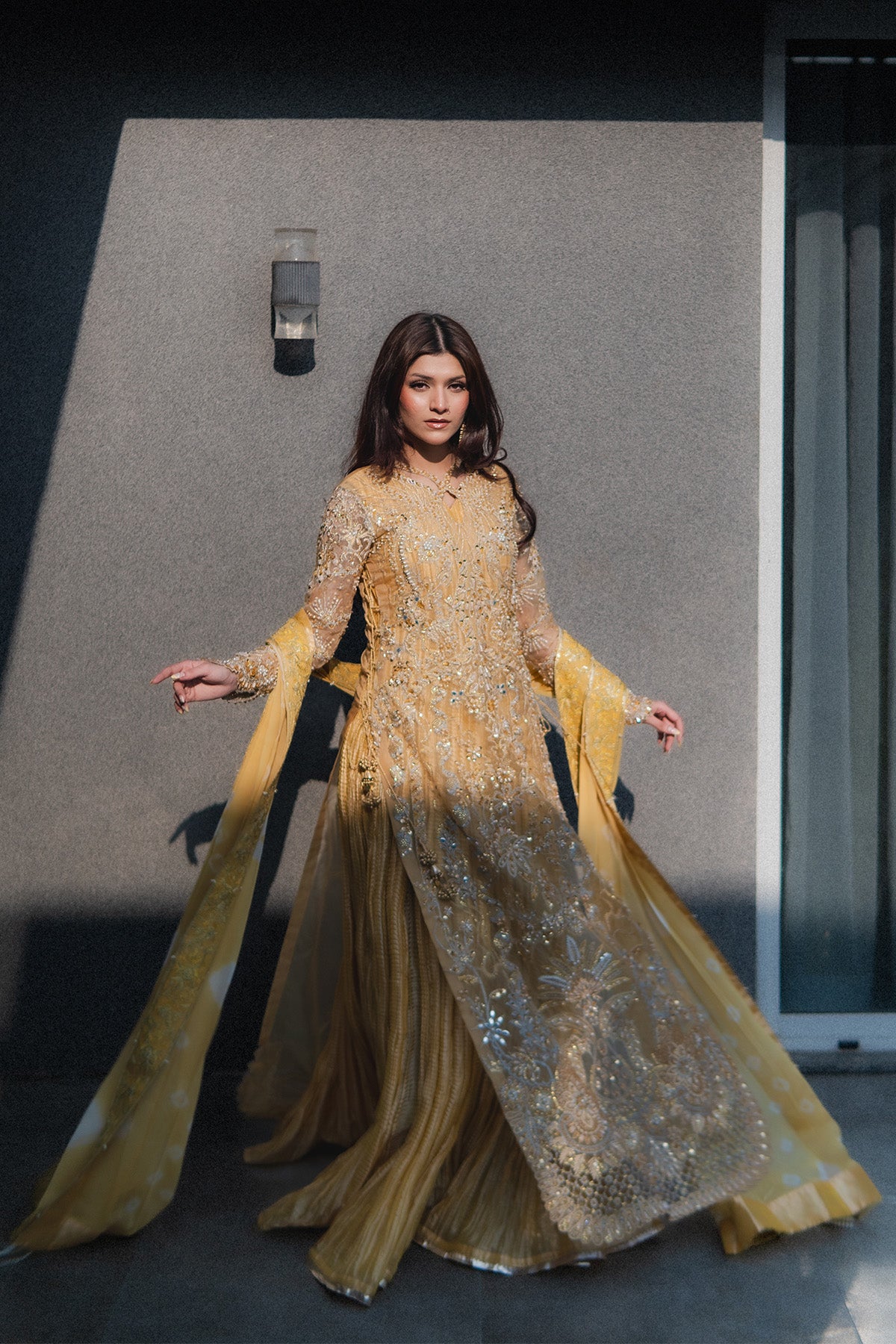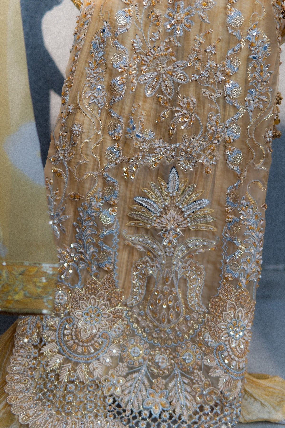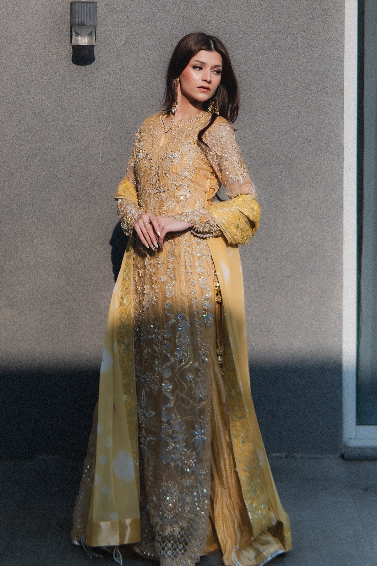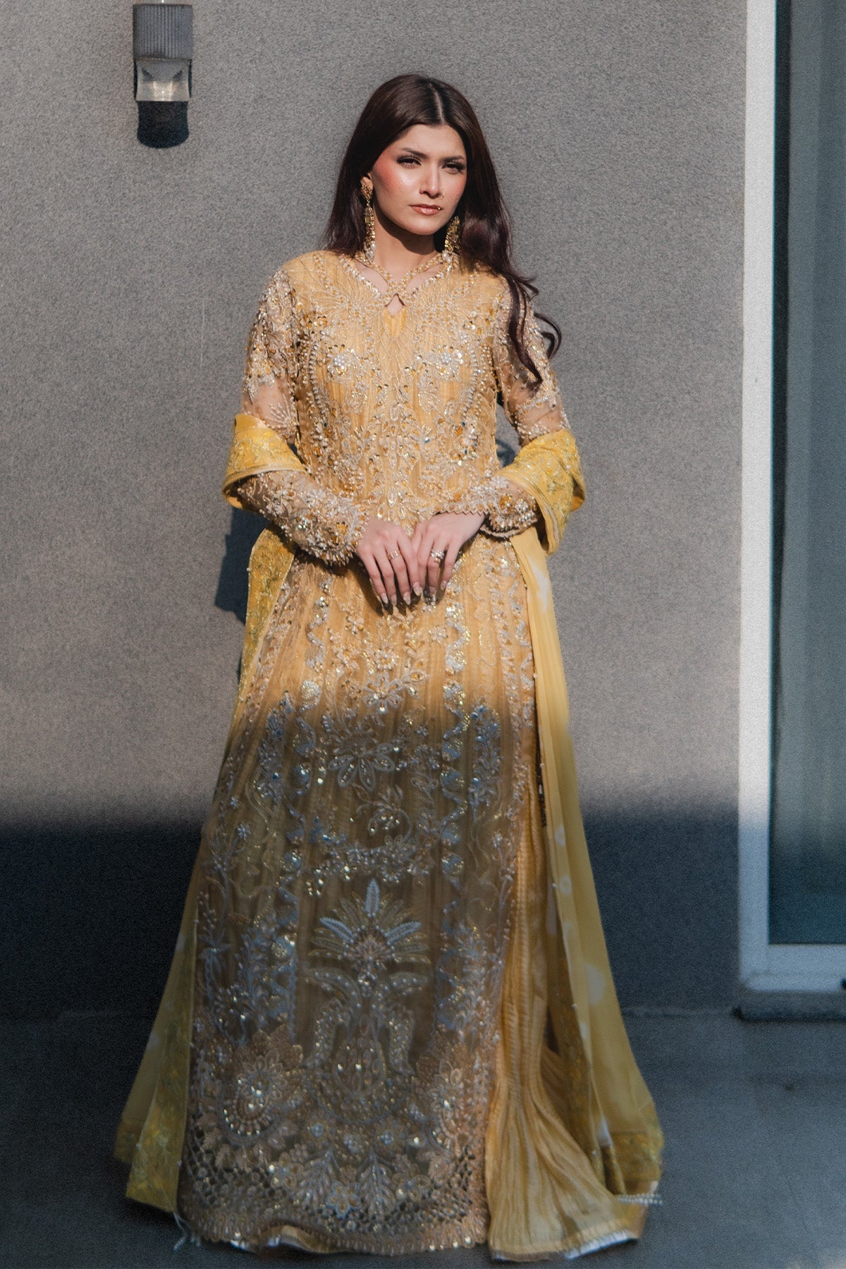 Organza long shirt, embellished heavily, fitted sleeves, embroidery in Yellow, Silver, chandi, tilla, Copper, and gold, finished with heavy hand worked shirt and scalped sleeves. Same-tone Missouri silk Sleeveless Pishwas, with boarder finish. Chunri Dye chiffon dupatta with pleases and boarder, detailed with stones and crystals, sequences. No visibility of stomach or deep neckline to the customer piece, Layered underneath Length of Shirt 56 inches