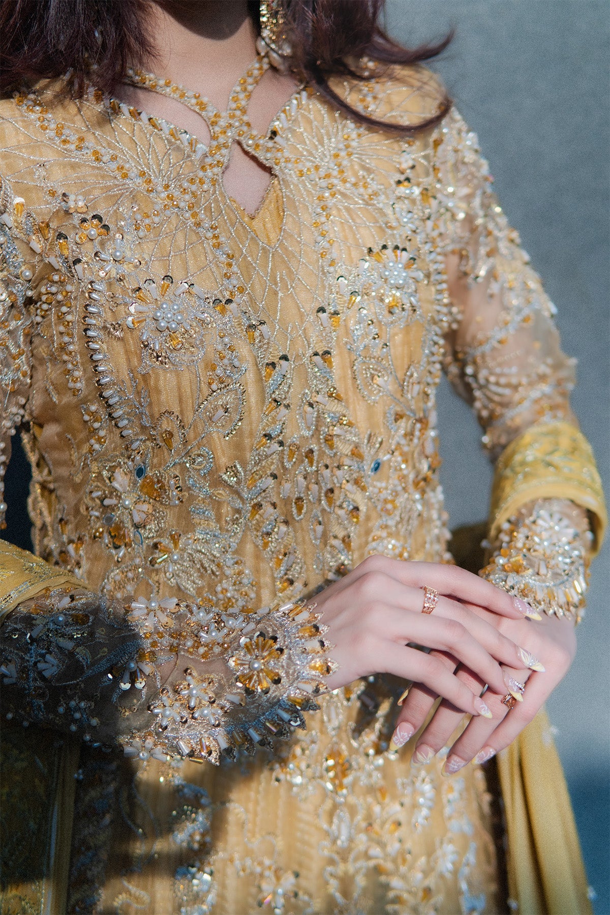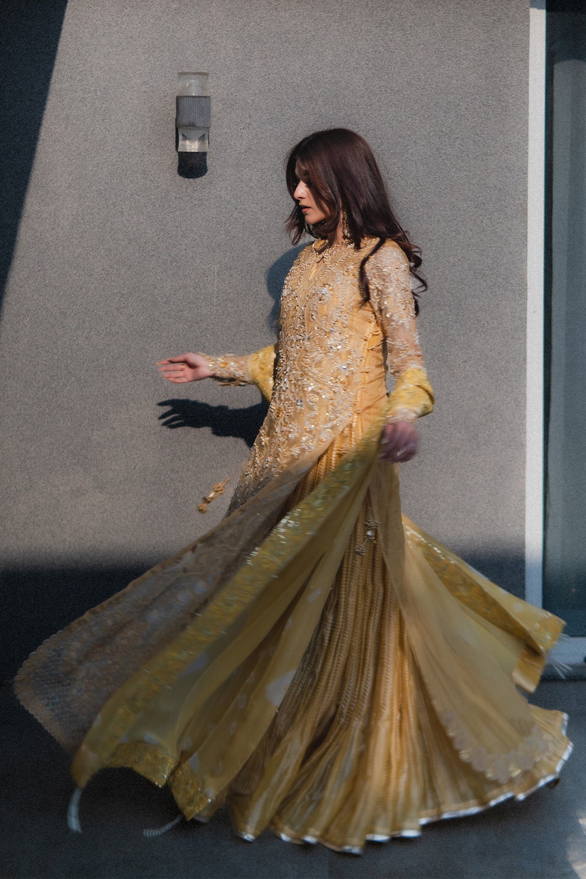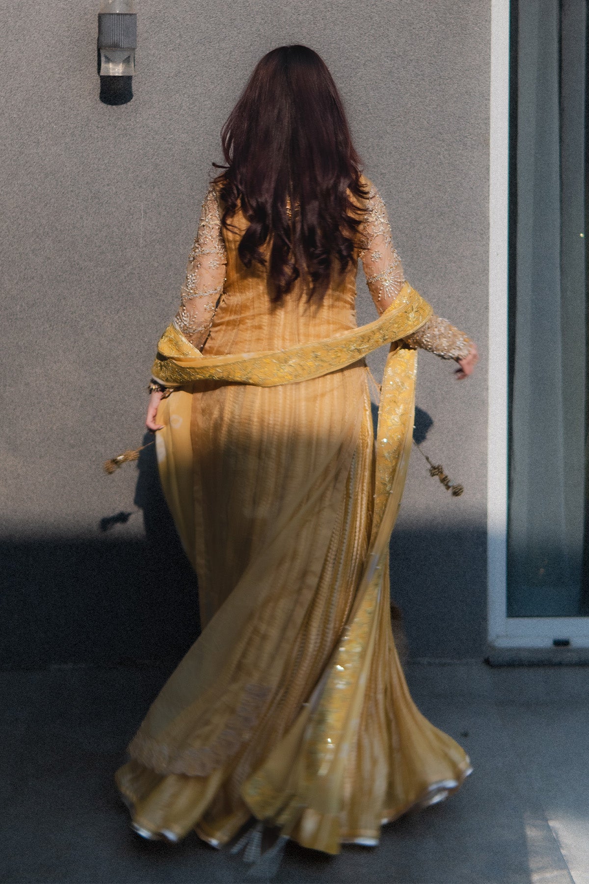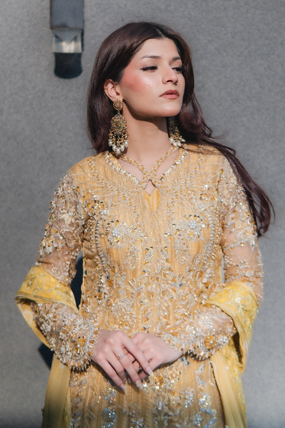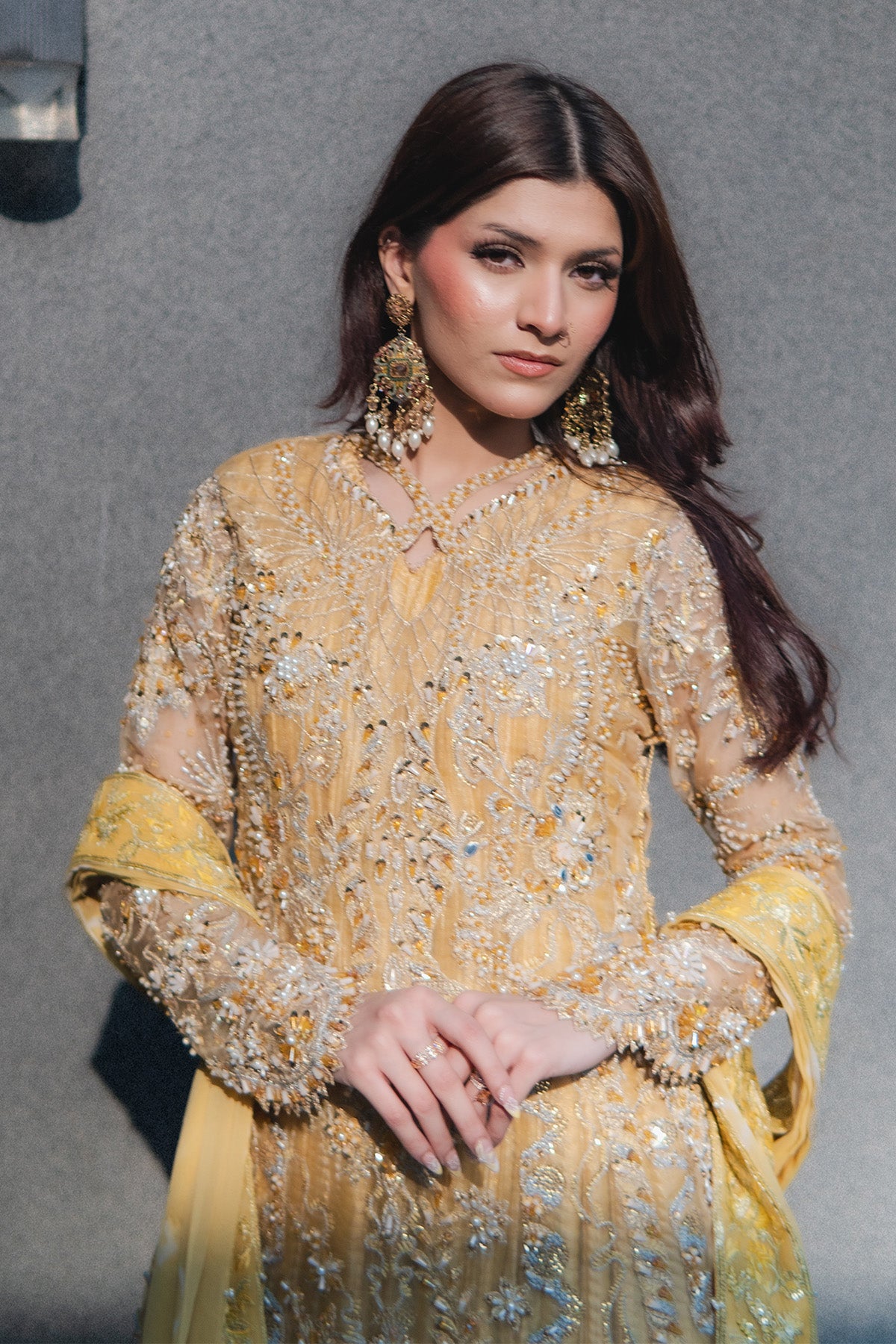 Organza long shirt, embellished heavily, fitted sleeves, embroidery in Yellow, Silver, chandi, tilla, Copper, and gold, finished with heavy hand worked shirt and scalped sleeves. Same-tone Missouri silk Sleeveless Pishwas, with boarder finish. Chunri Dye chiffon dupatta with pleases and boarder, detailed with stones and crystals, sequences. No visibility of stomach or deep neckline to the customer piece, Layered underneath Length of Shirt 56 inches