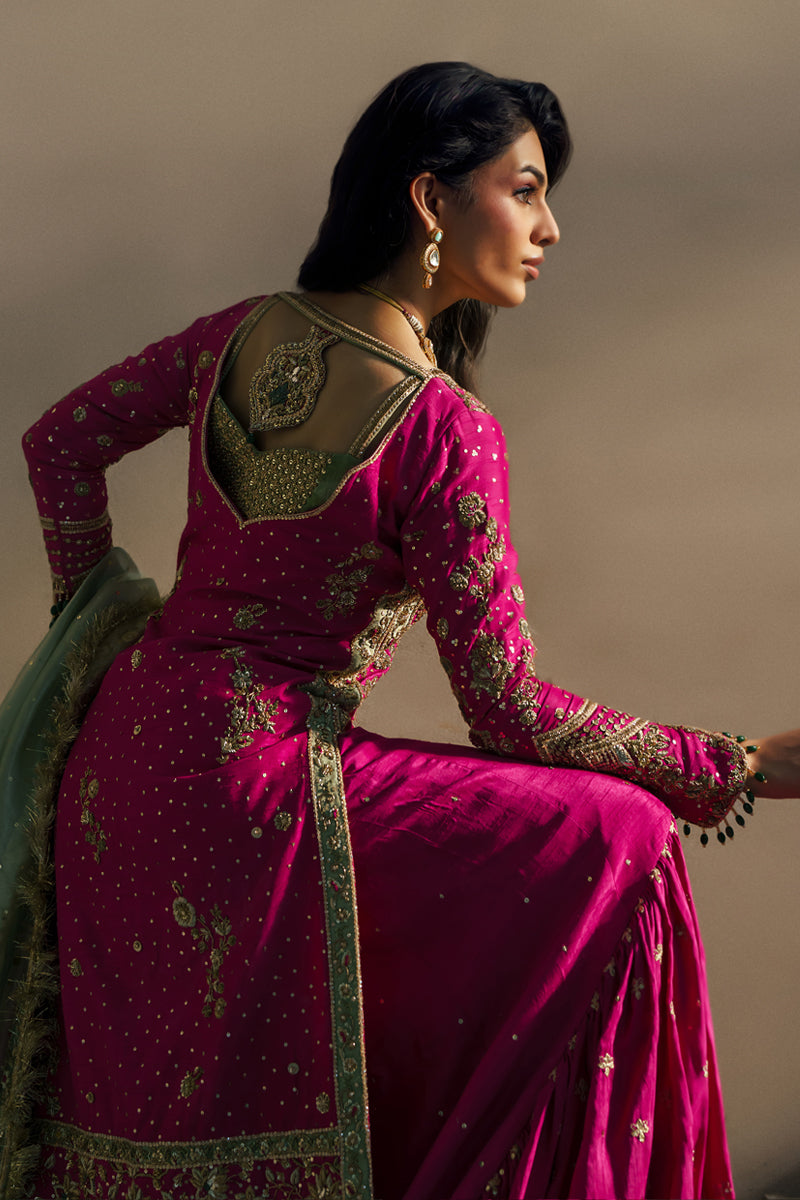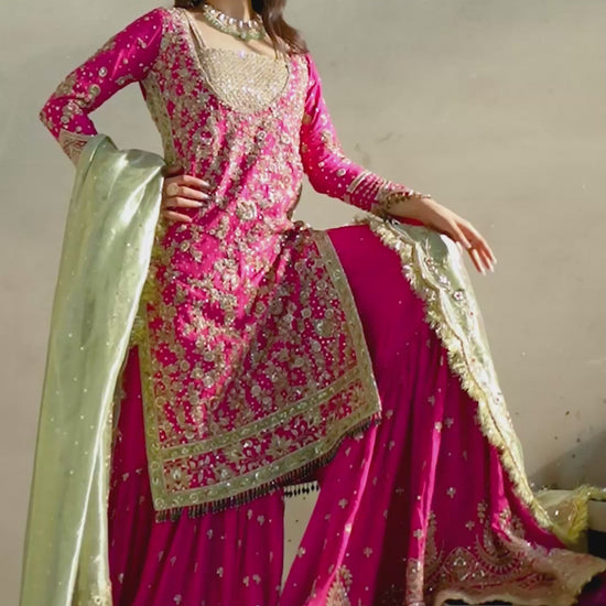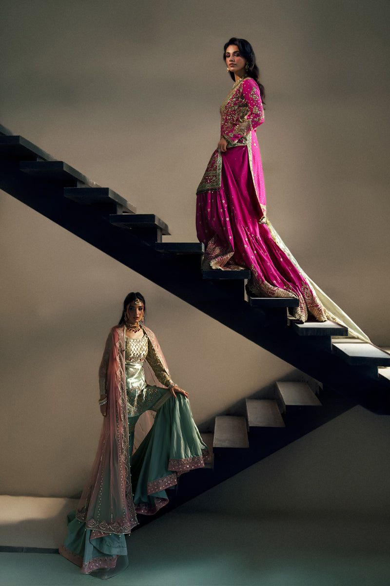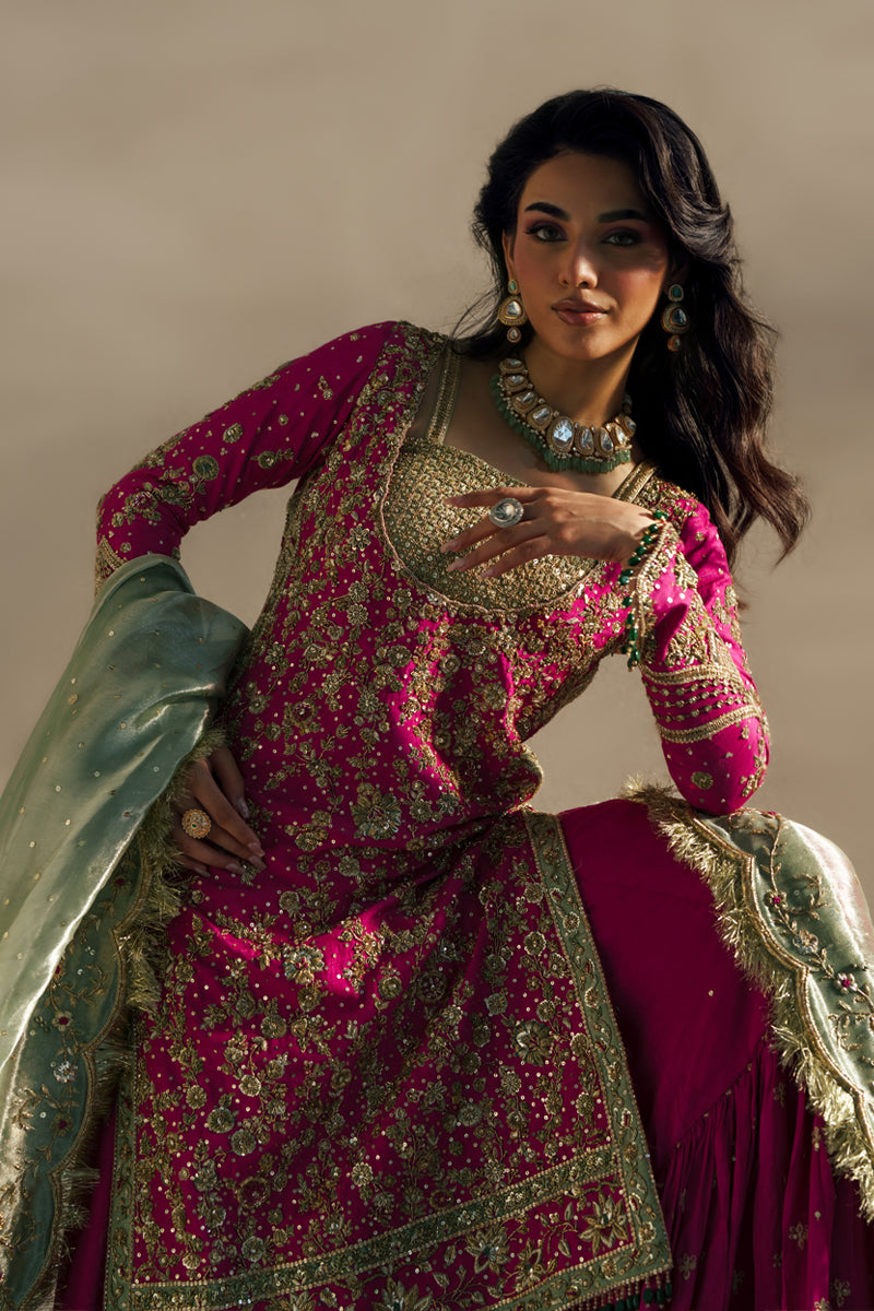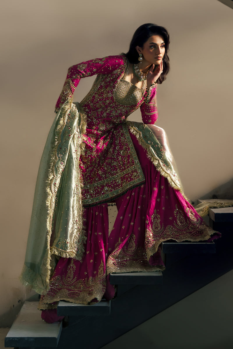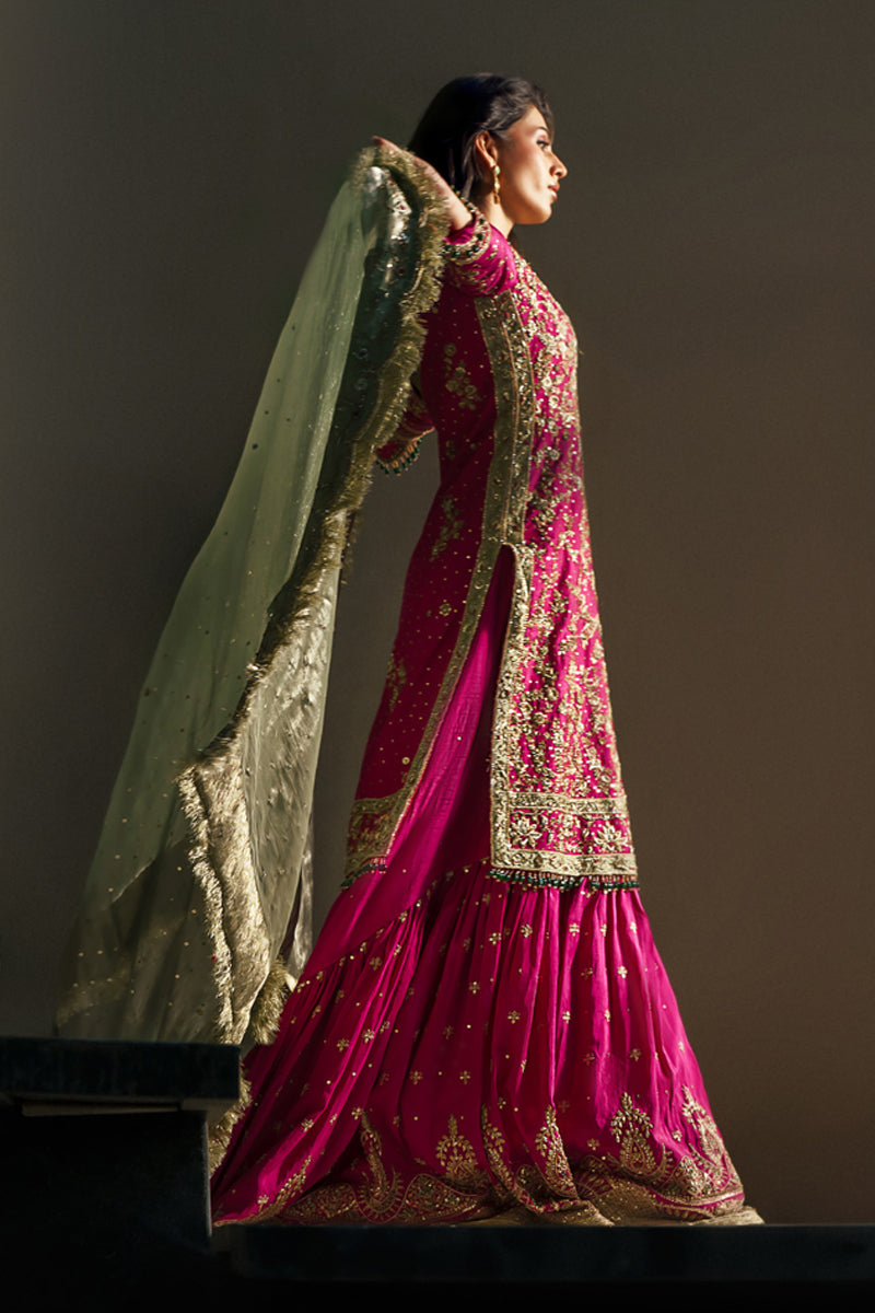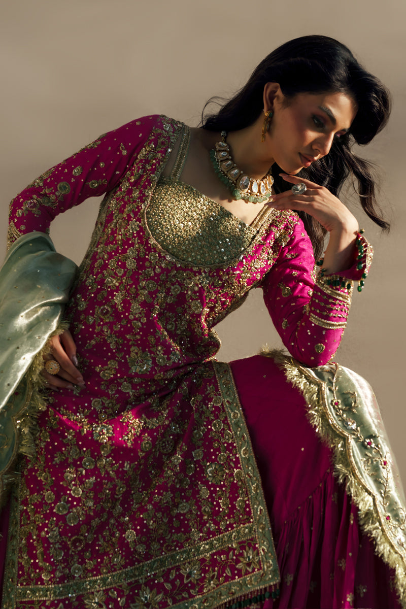 This vibrant magenta outfit features heavy gold embroidery on a long kurta paired with a flared sharara, creating a rich traditional look. It’s complemented by a contrasting pastel green dupatta with ornate detailing, adding a soft elegance.