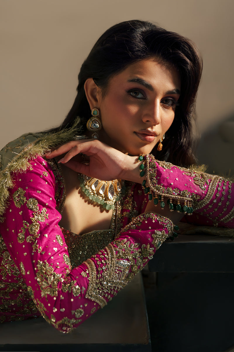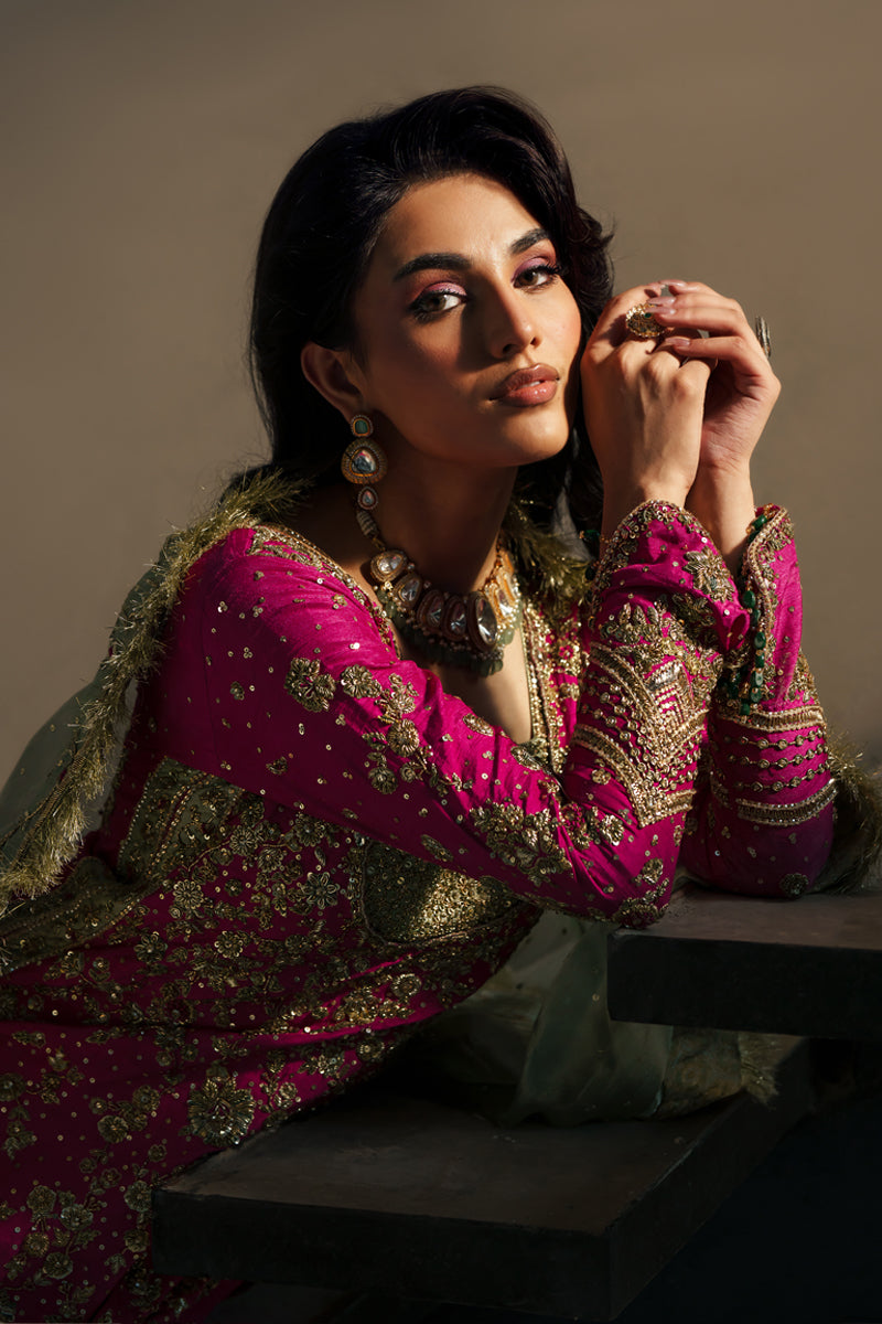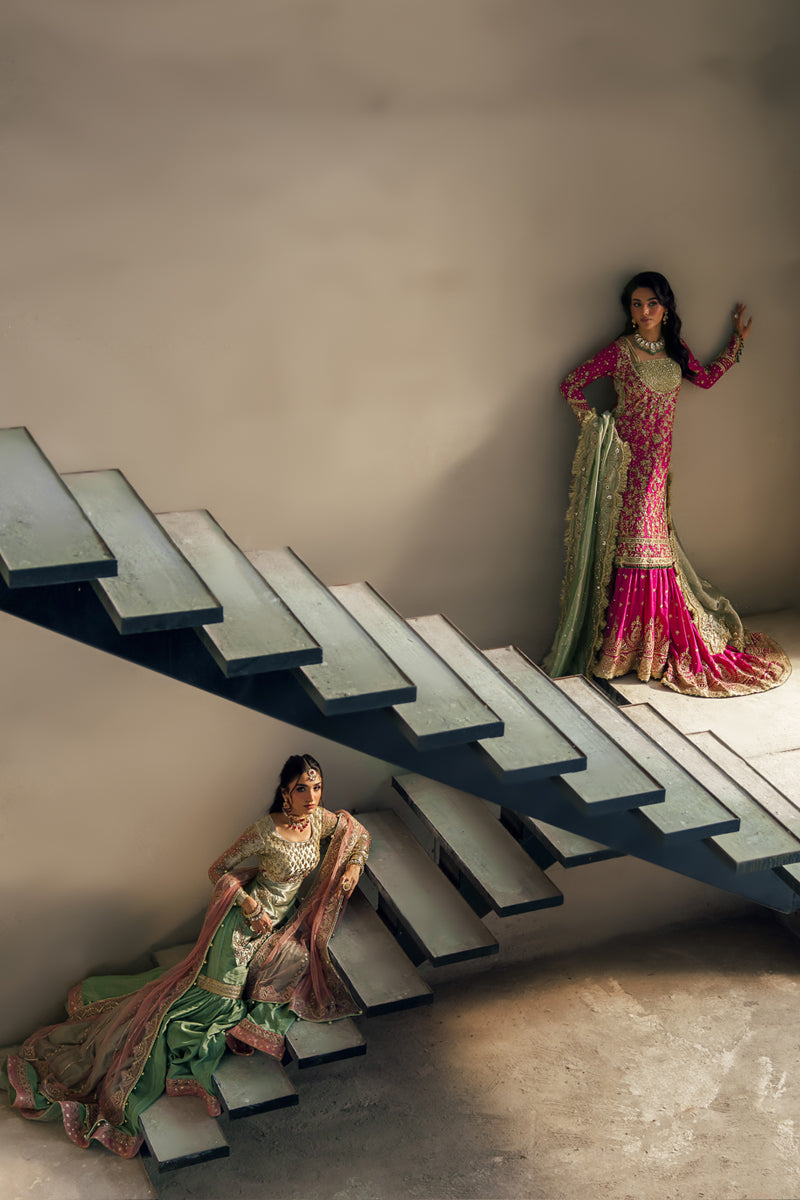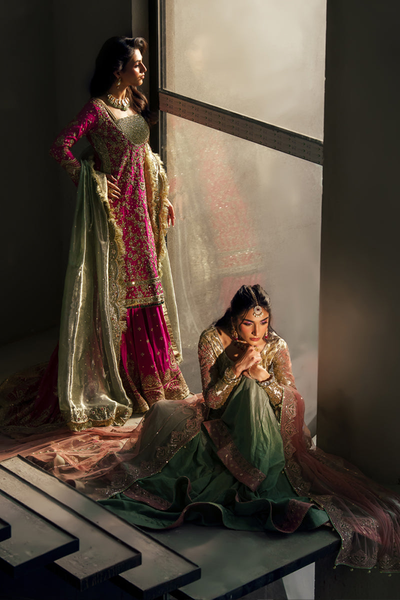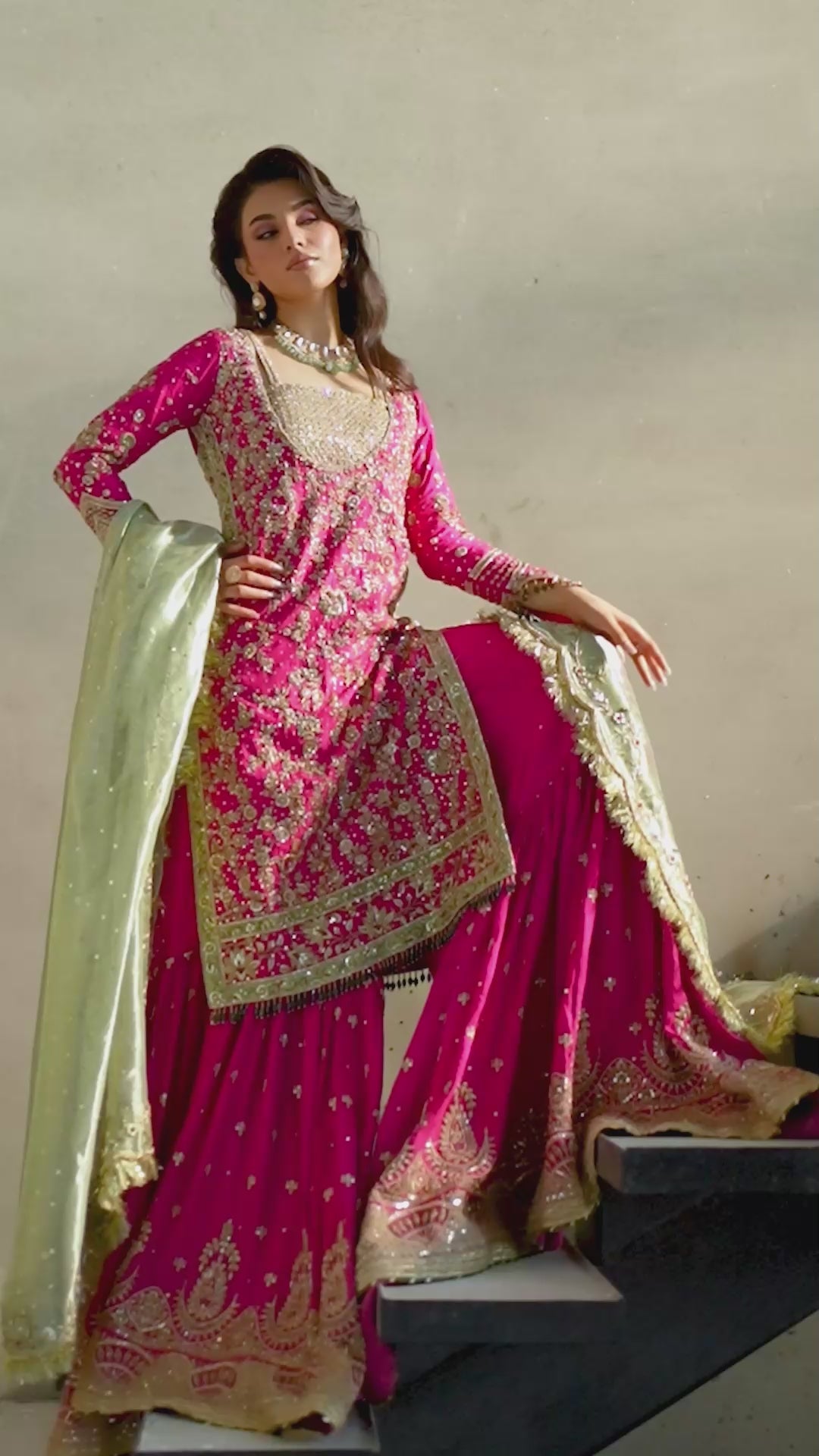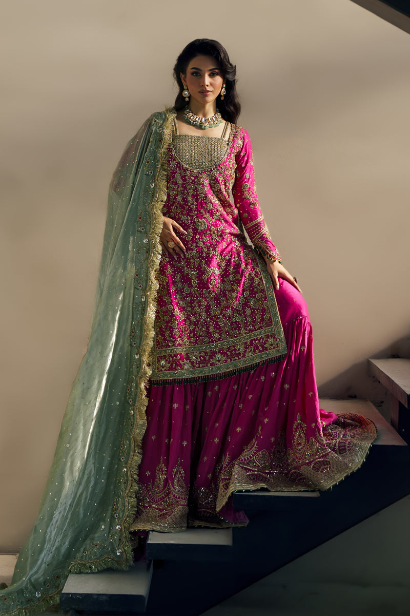 This vibrant magenta outfit features heavy gold embroidery on a long kurta paired with a flared sharara, creating a rich traditional look. It’s complemented by a contrasting pastel green dupatta with ornate detailing, adding a soft elegance.