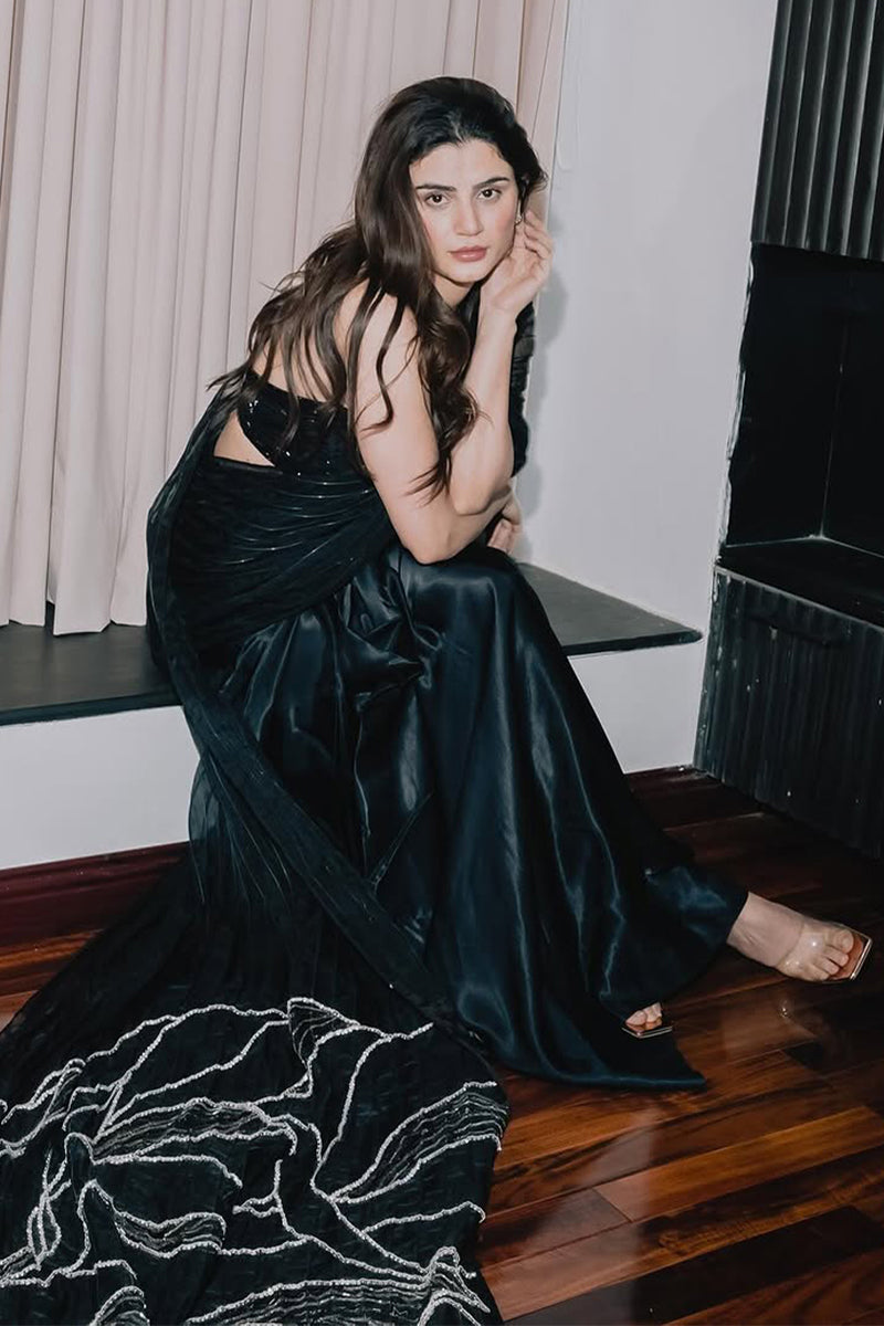 This avant-garde fusion tissue string saree is a striking blend of contemporary design and classic draping. Crafted in a rich, inky black shamouse silk fabric, it features a sensuous, structured blouse with intricate textural detailing. The saree is artfully draped to perfection, featuring pleats that cascade into a stunningly embroidered pallu with shimmering silver threadwork, reminiscent of flowing water. The asymmetrical silhouette paired with bold cutouts adds a modern edge, perfect for the confident woman who seeks a bold, yet sophisticated, statement look. Whether worn at a high-fashion event or a cultural celebration, this ensemble exudes a dramatic allure  making it a signature sarree of ARE.